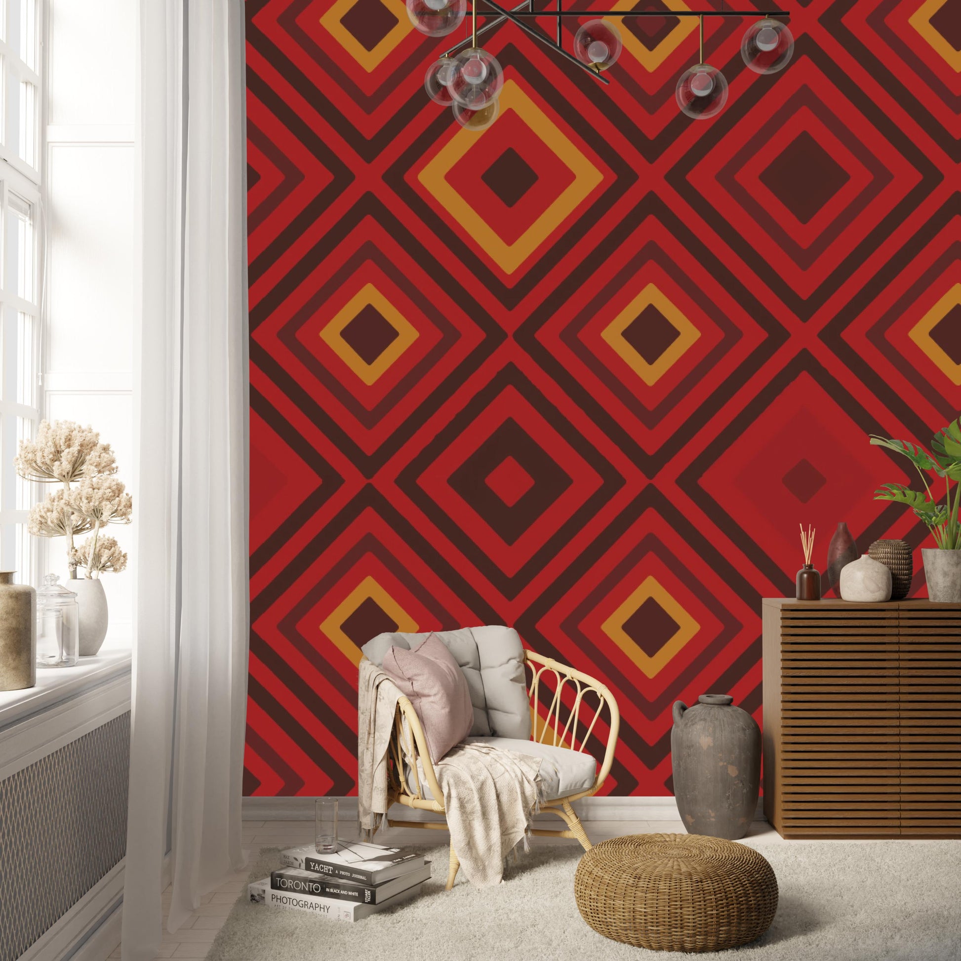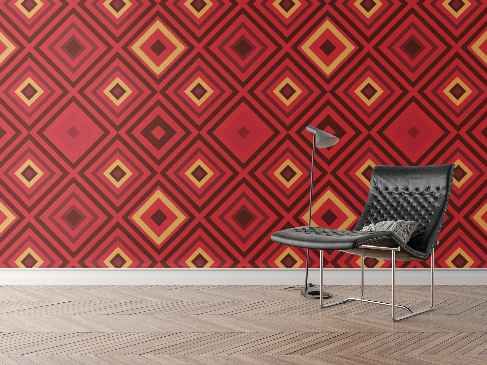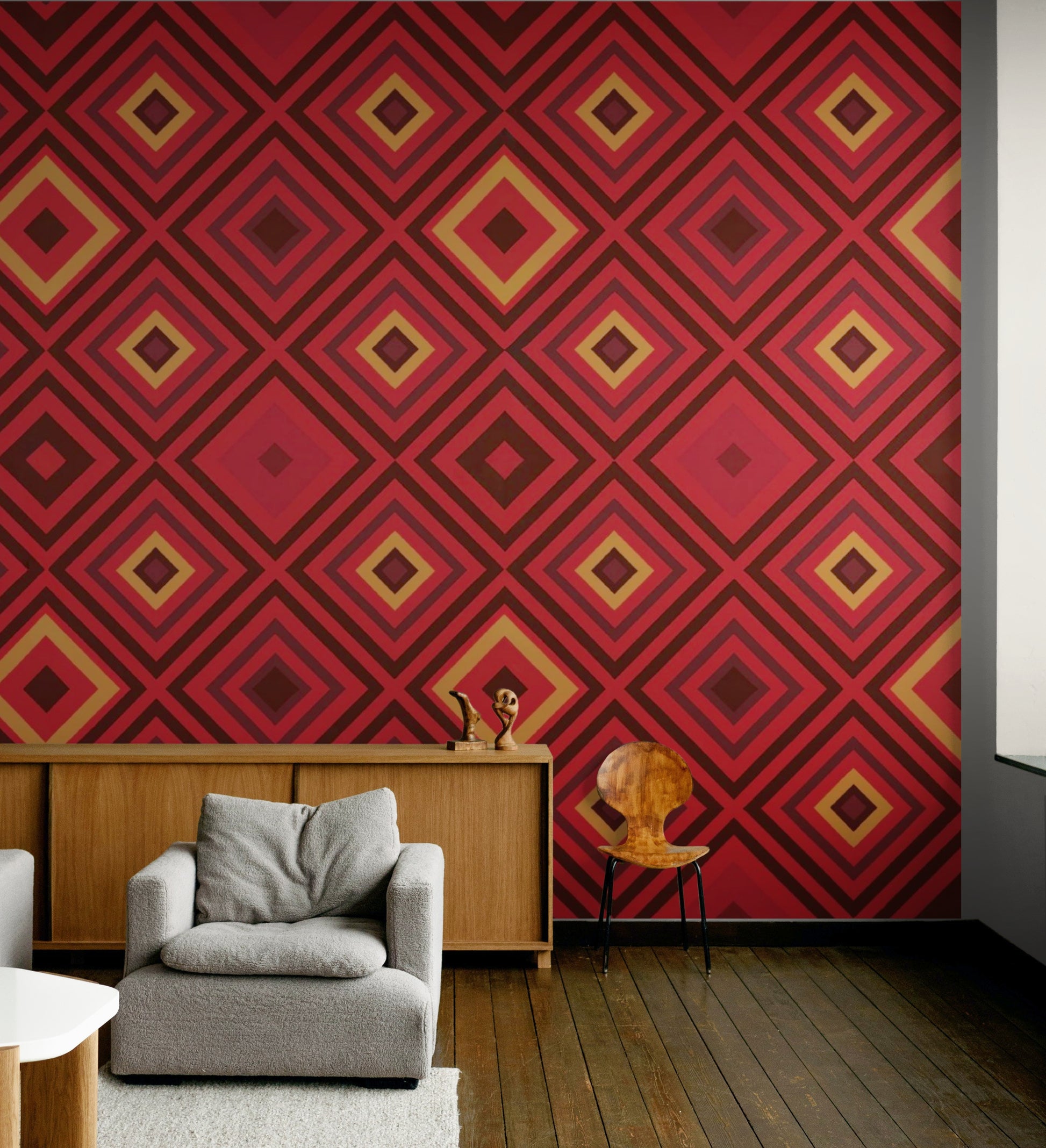 Introducing Cindy, the retro rebel of wallpaper with her dynamic diamond and square pattern, pops of gold, and just a touch of psychedelic flair.