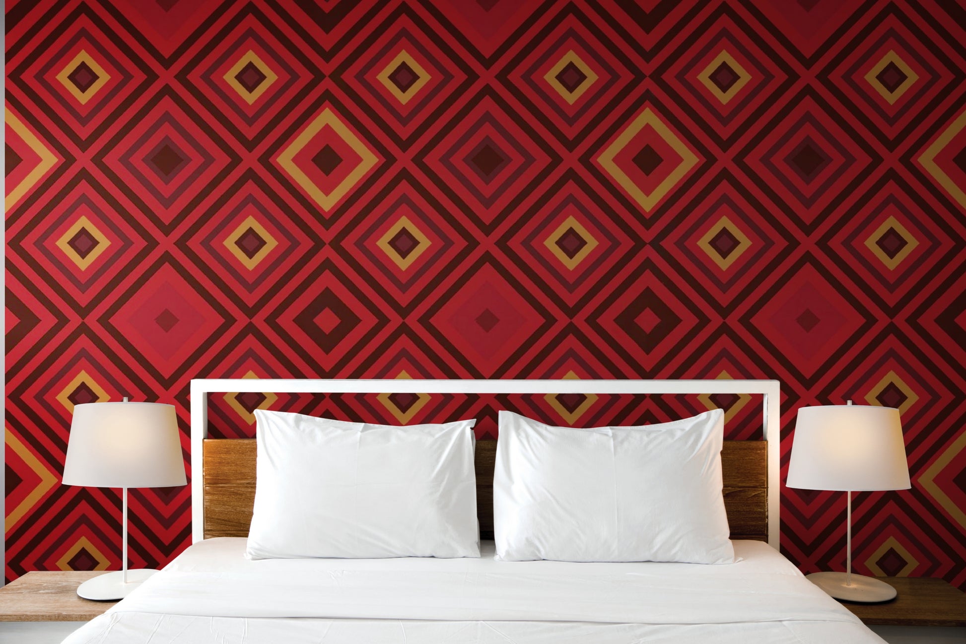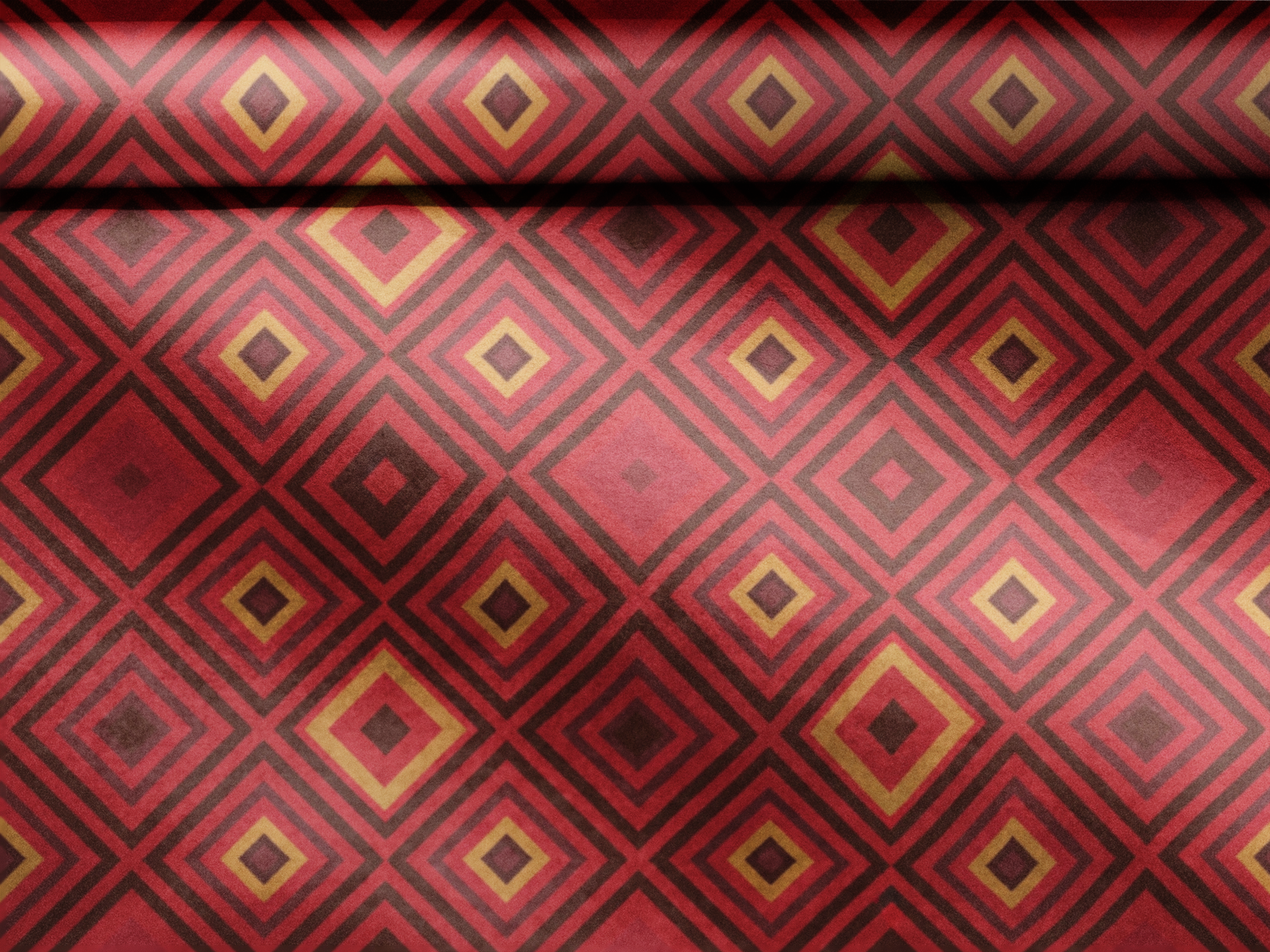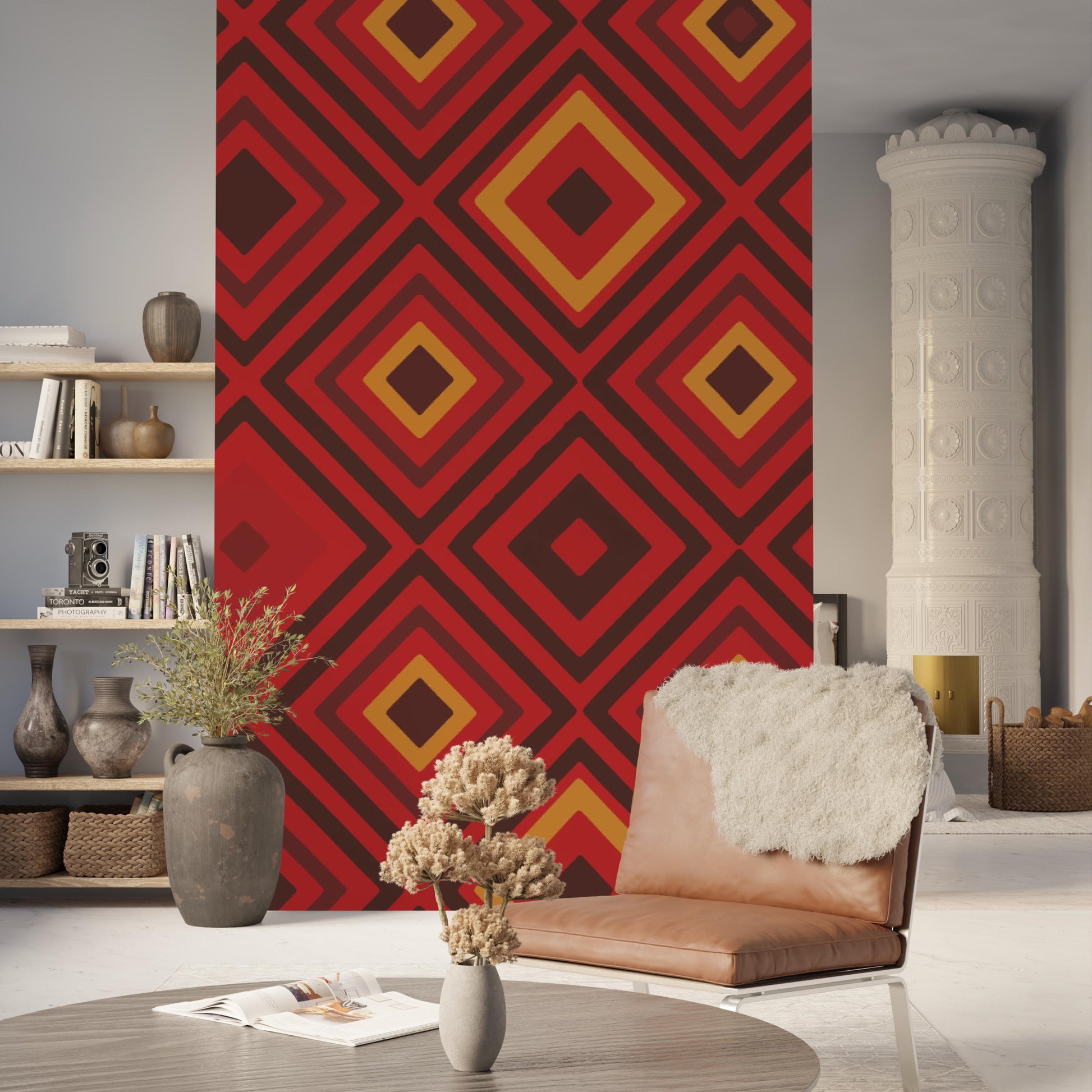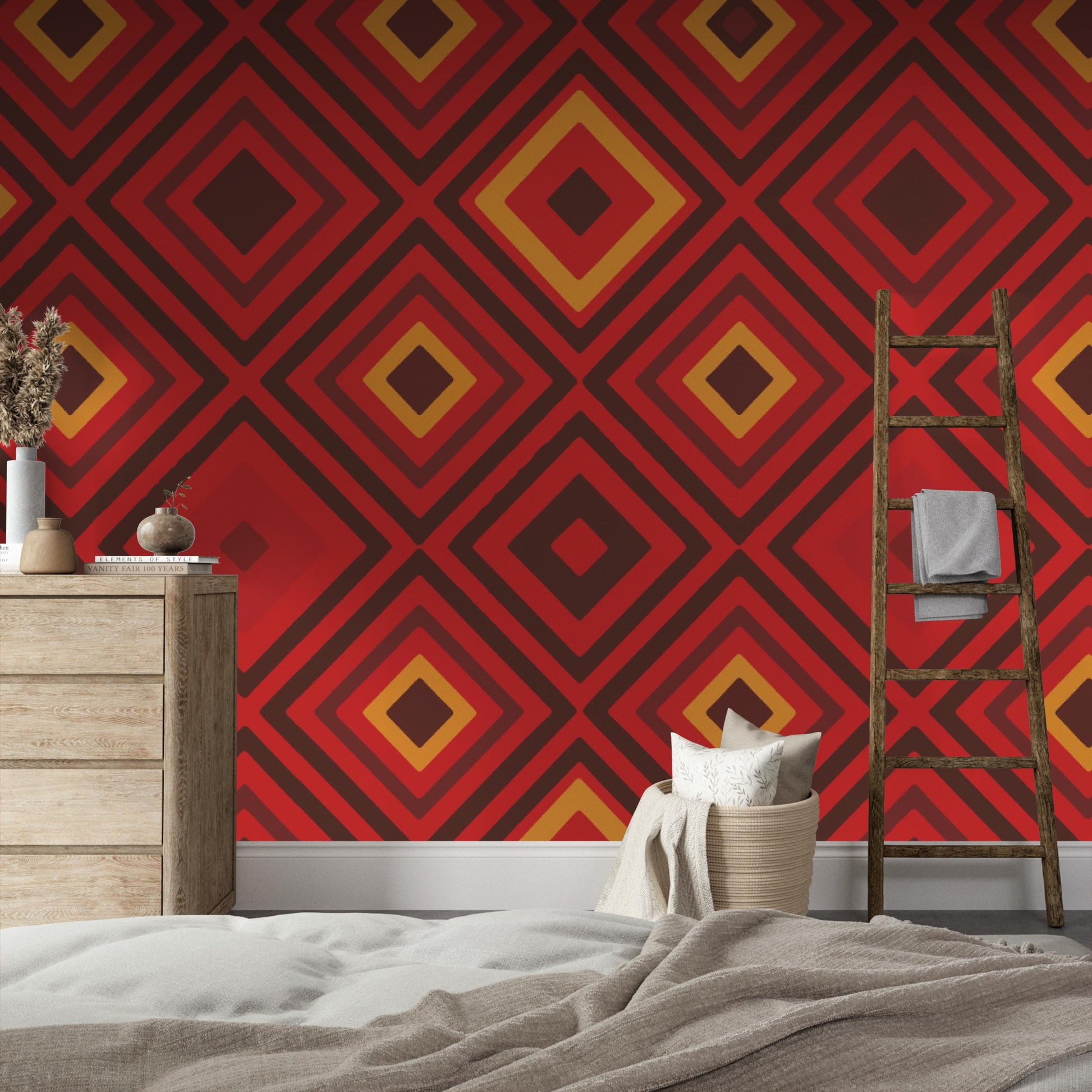 Introducing Cindy, the retro rebel of wallpaper with her dynamic diamond and square pattern, pops of gold, and just a touch of psychedelic flair.