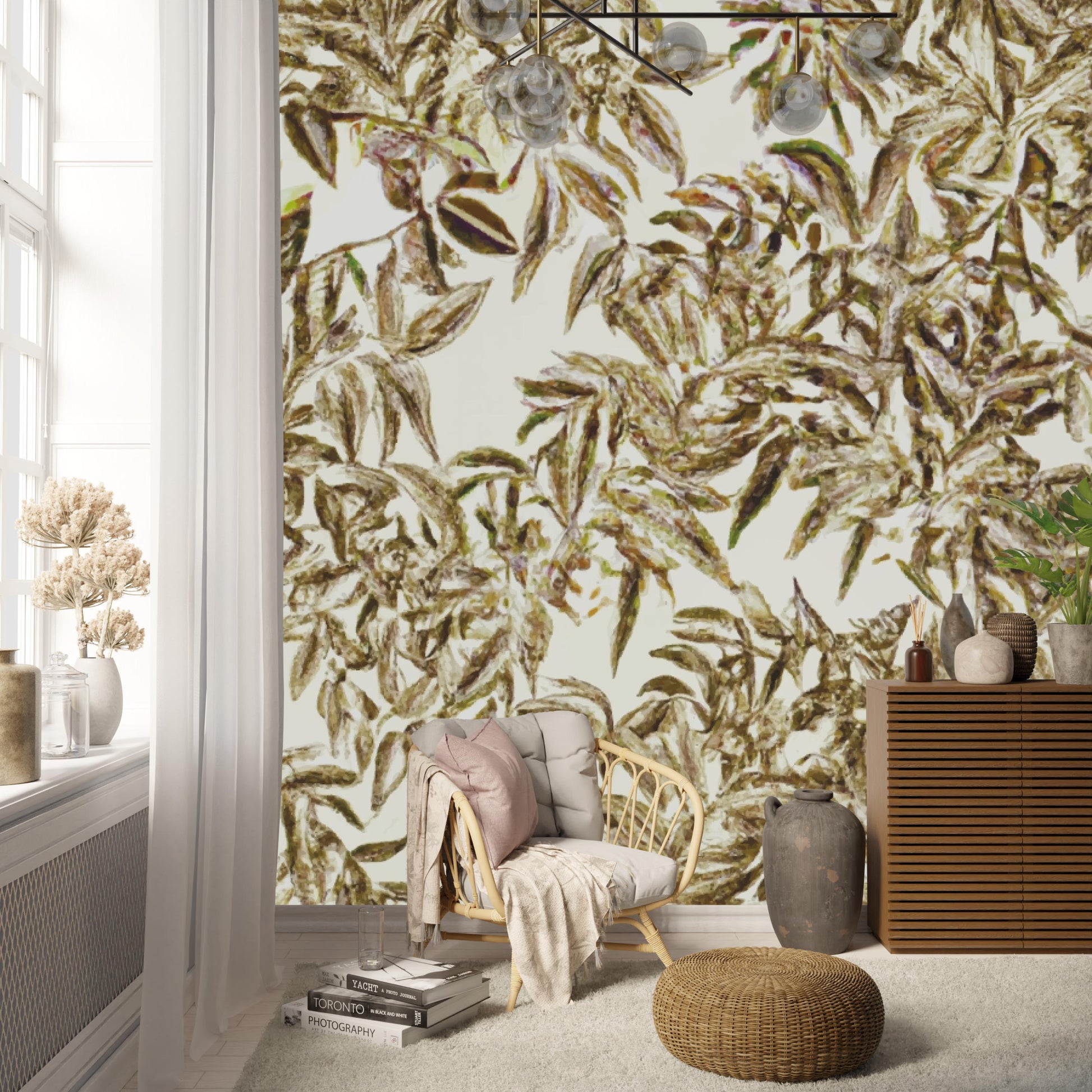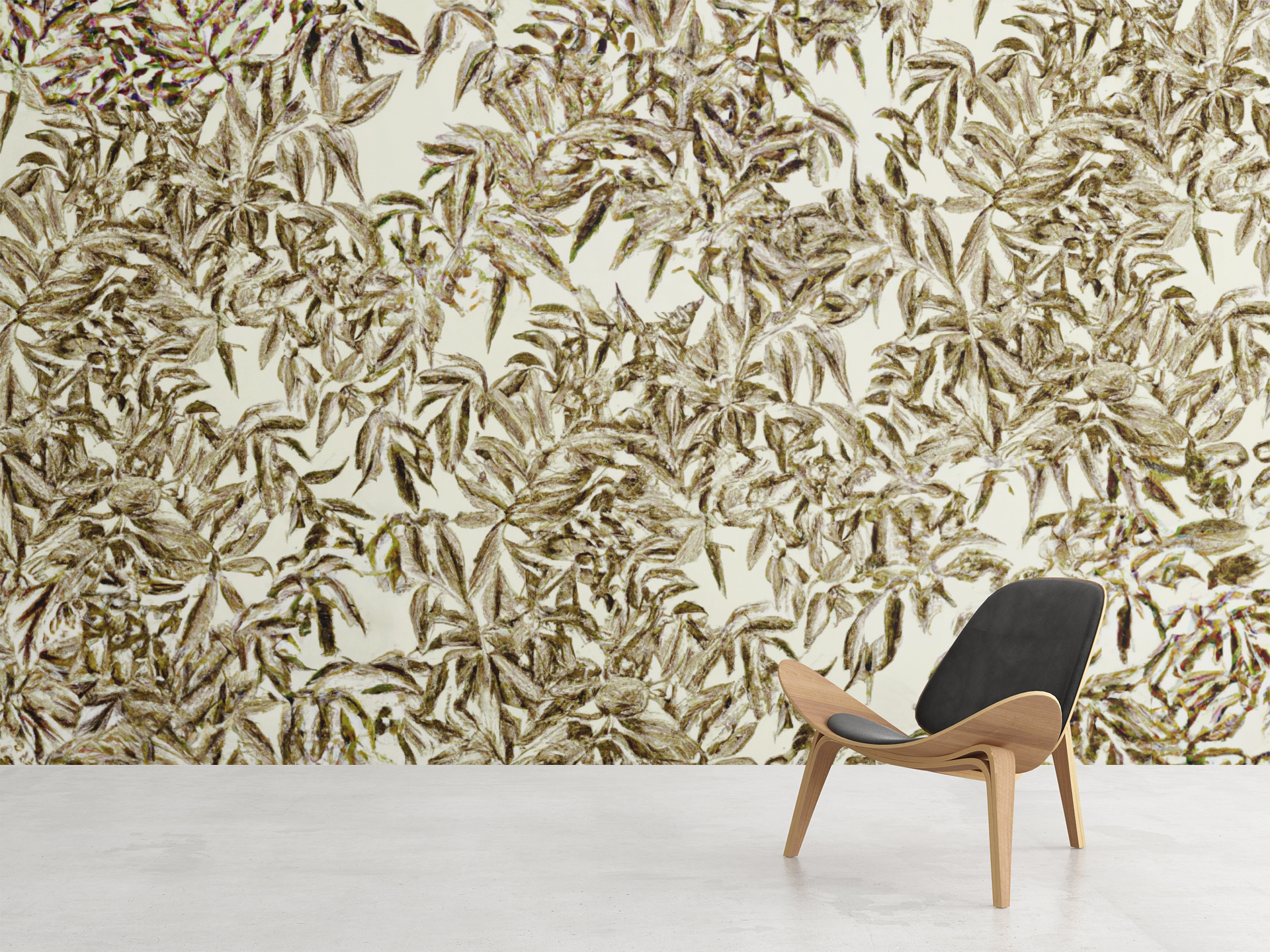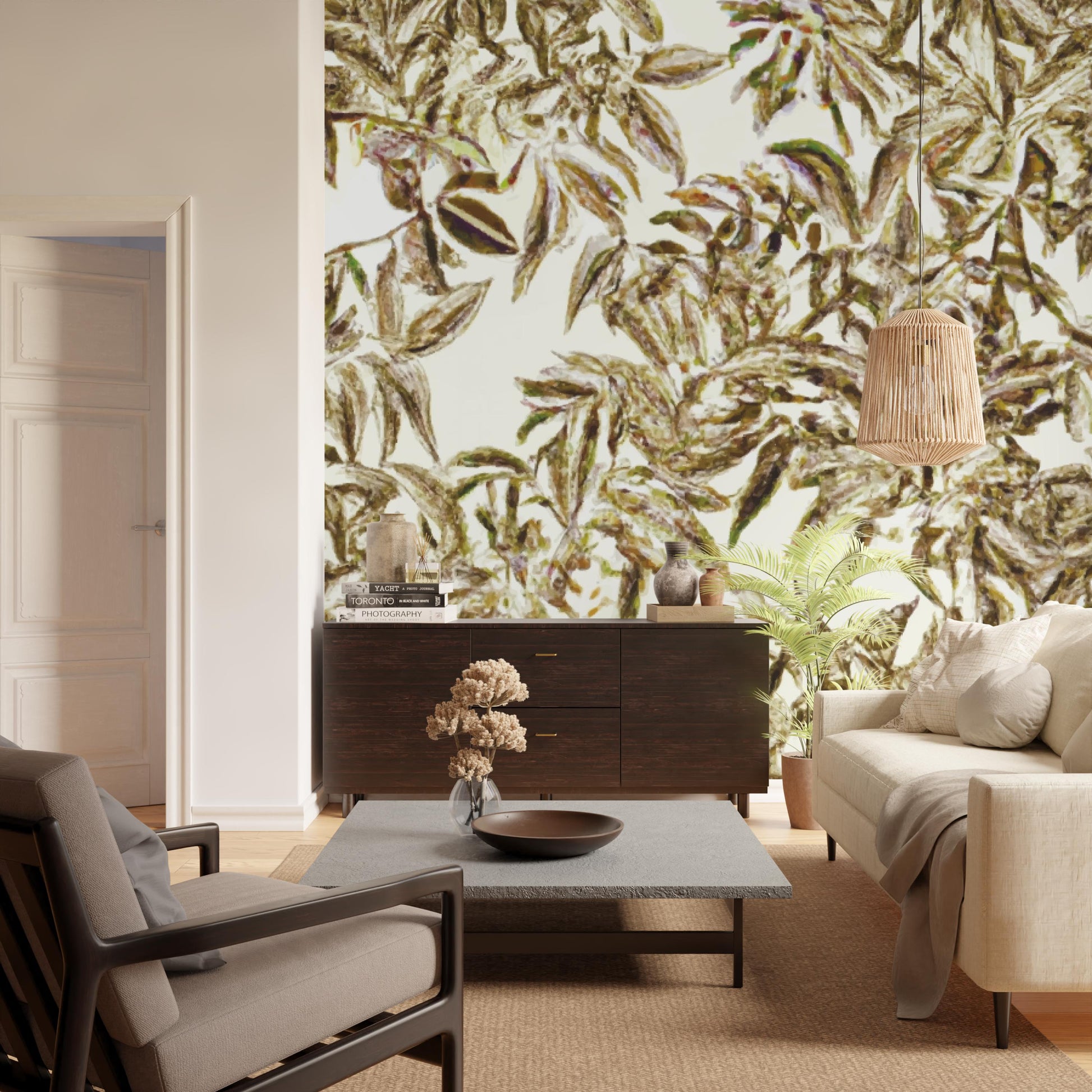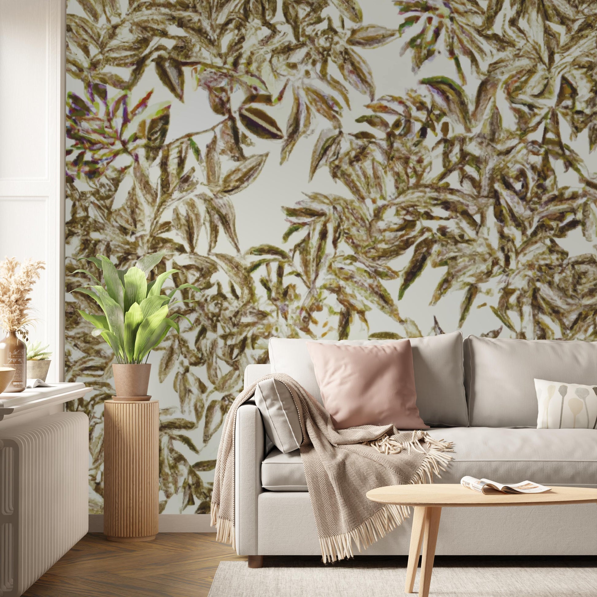 Transport yourself to a tropical paradise with Hush - an understated wallpaper featuring delicately sketched leaves in lush shades of green.