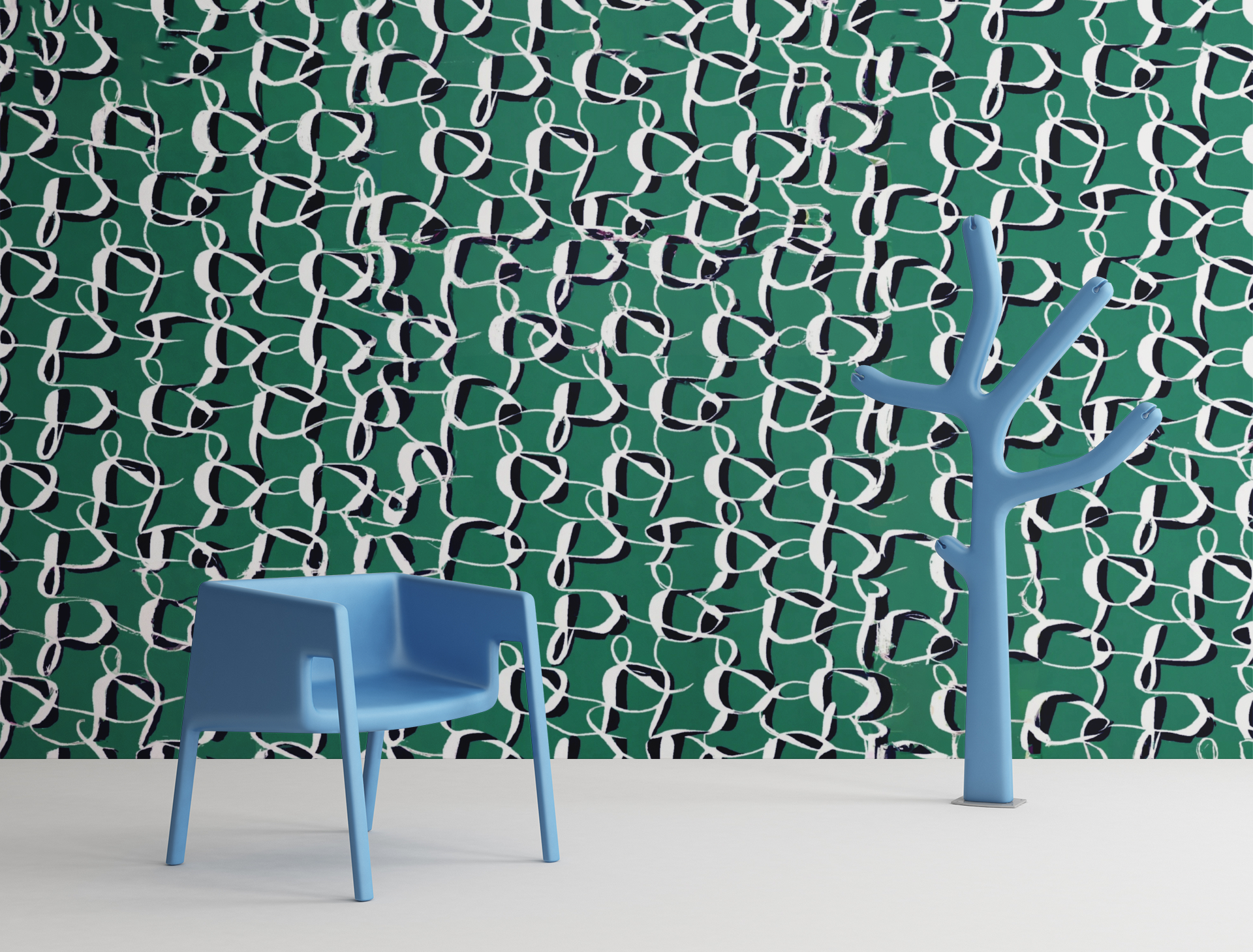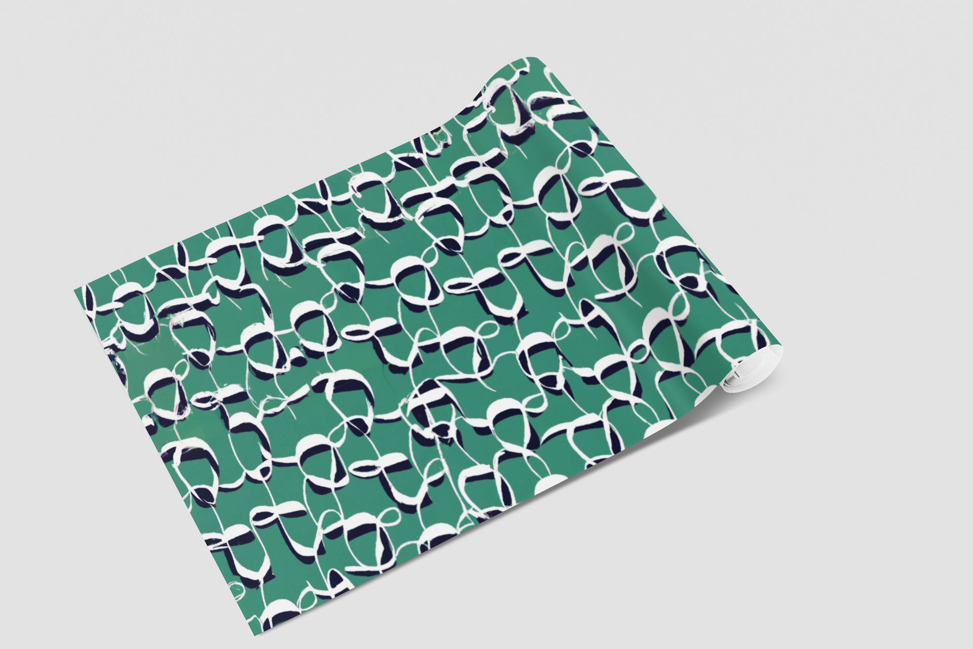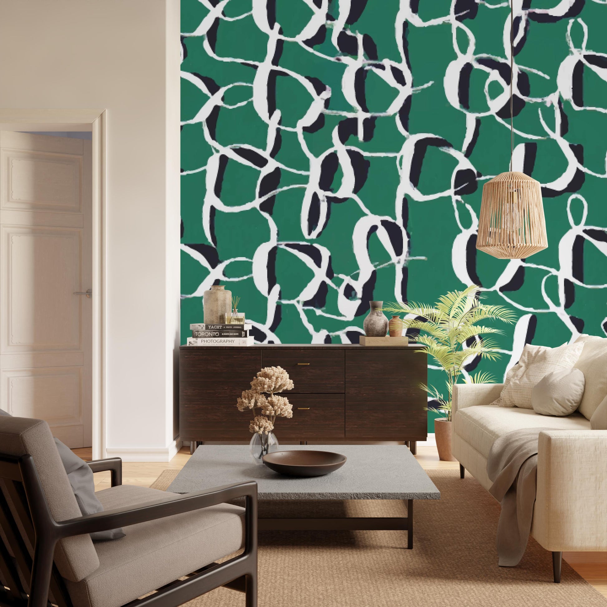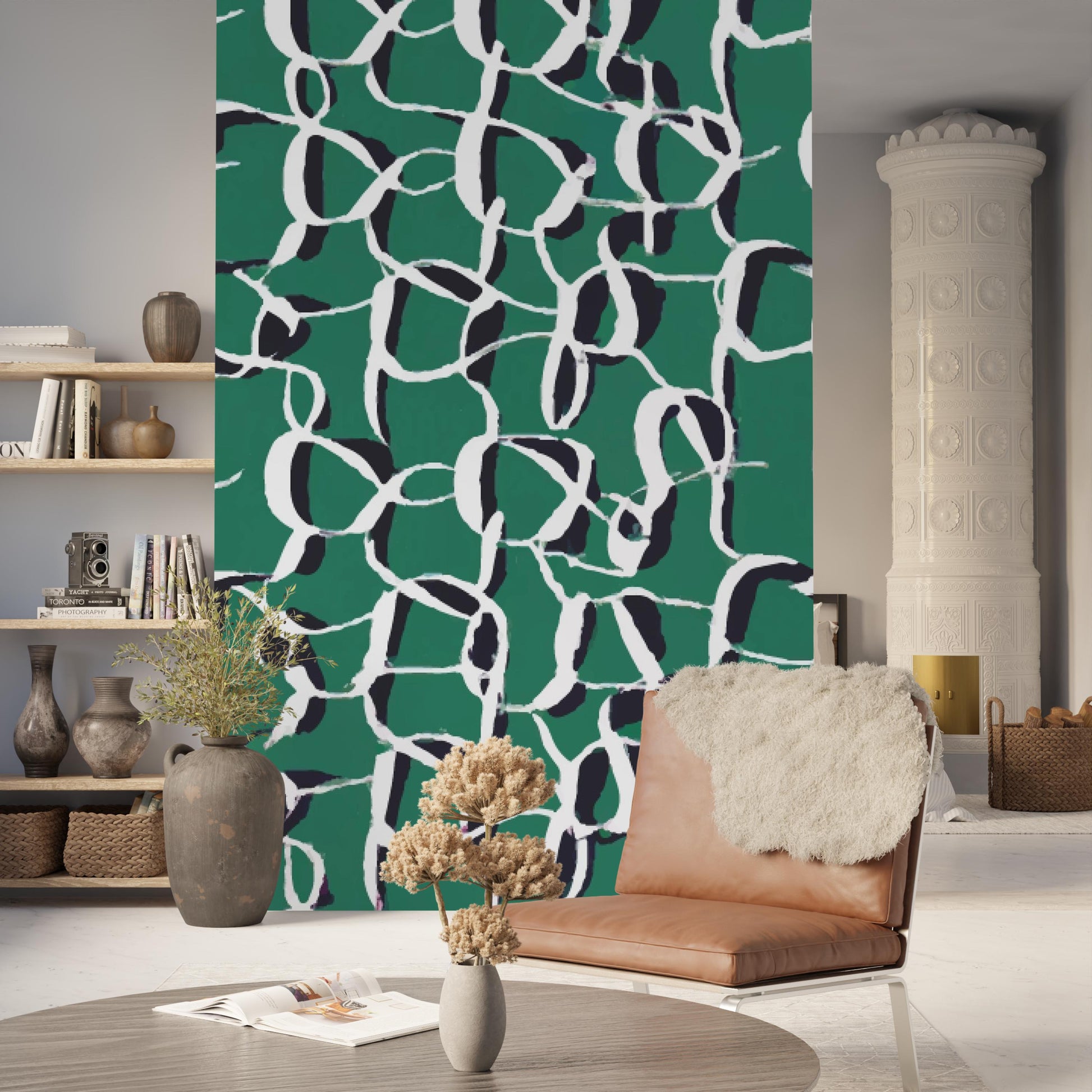 Introducing a stunning wallpaper named after a woman whose elegance and grace inspired this green and navy blue pattern of abstract circles, resembling delicate chains of jewelry, adding a touch of sophistication to any space.