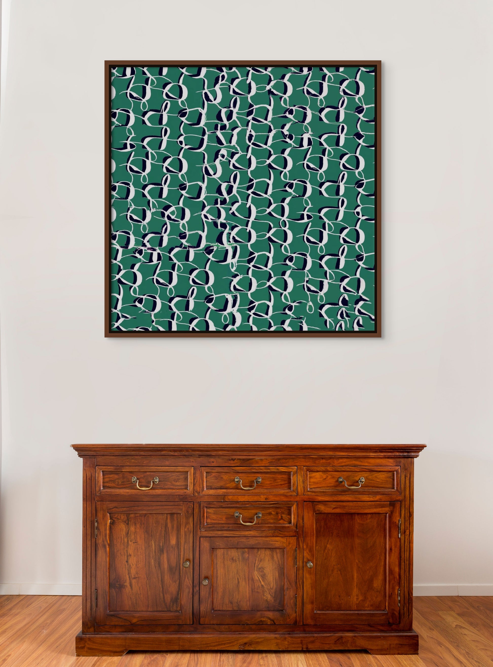 Introducing a stunning wallpaper named after a woman whose elegance and grace inspired this green and navy blue pattern of abstract circles, resembling delicate chains of jewelry, adding a touch of sophistication to any space.