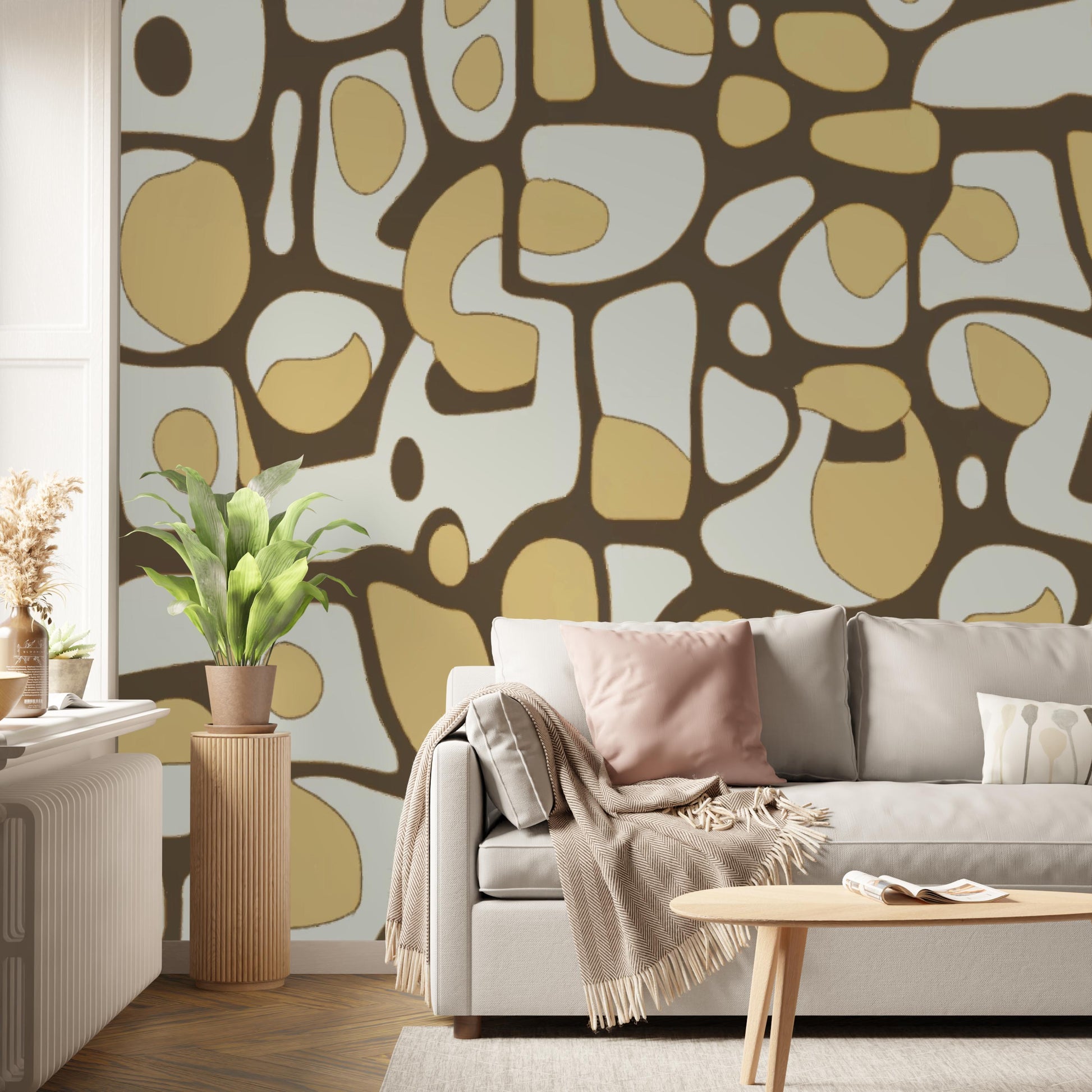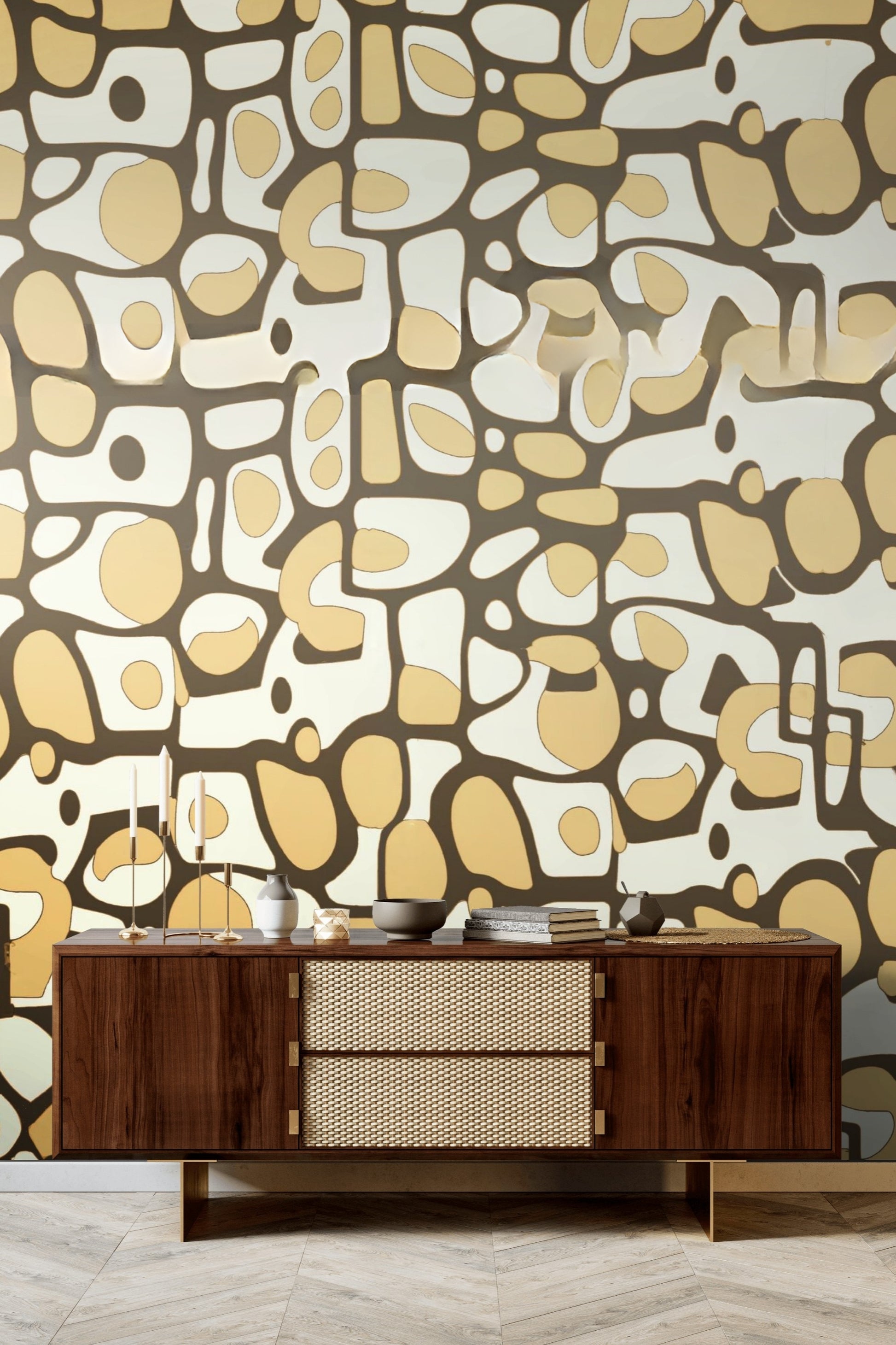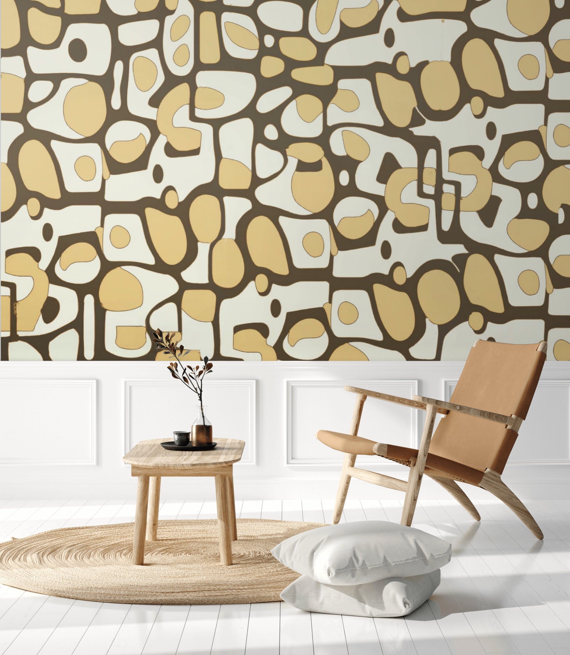 A charming and bold wallpaper design that combines vintage and modern aesthetics with its warm color palette and playful abstract shape.