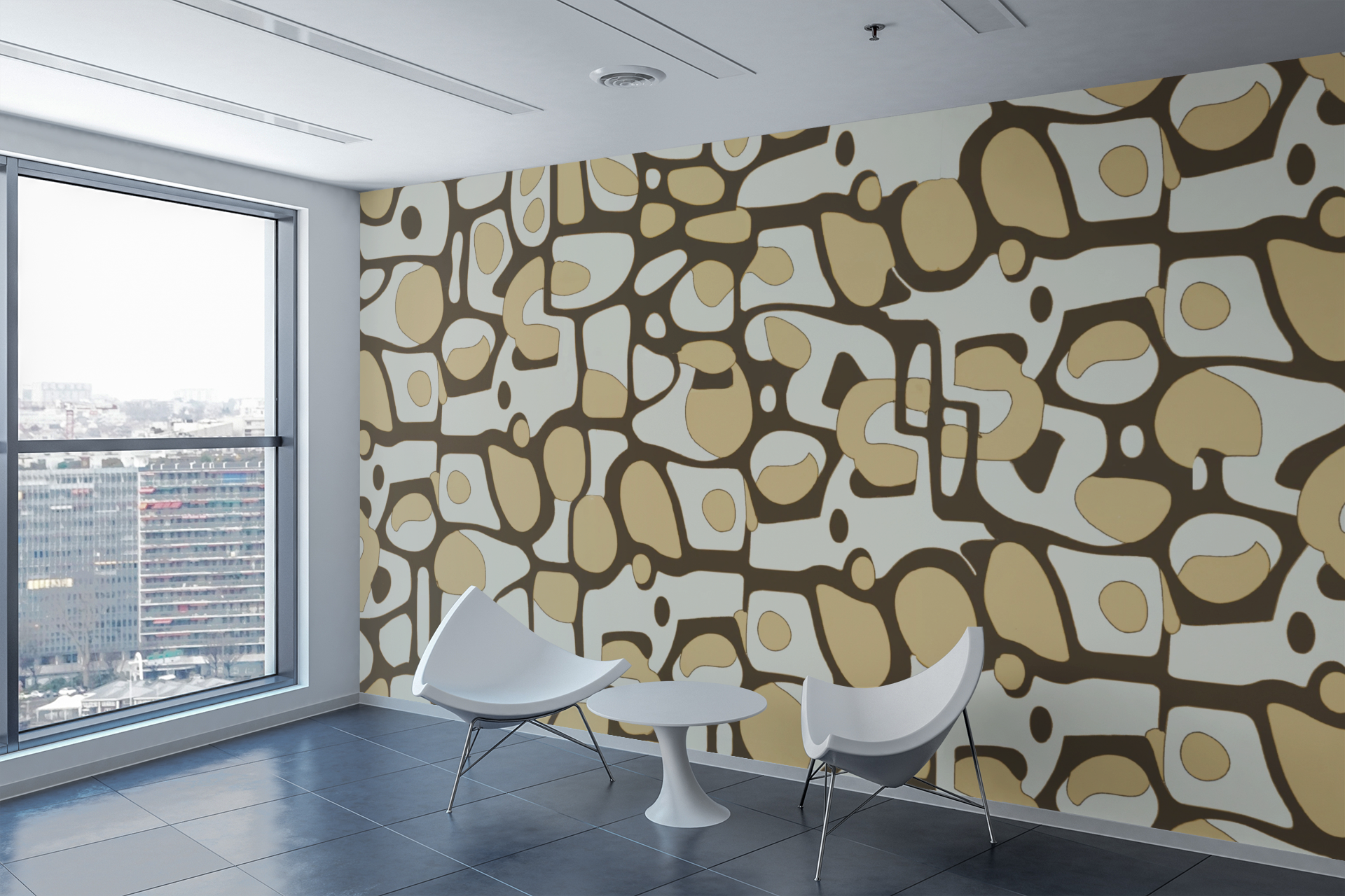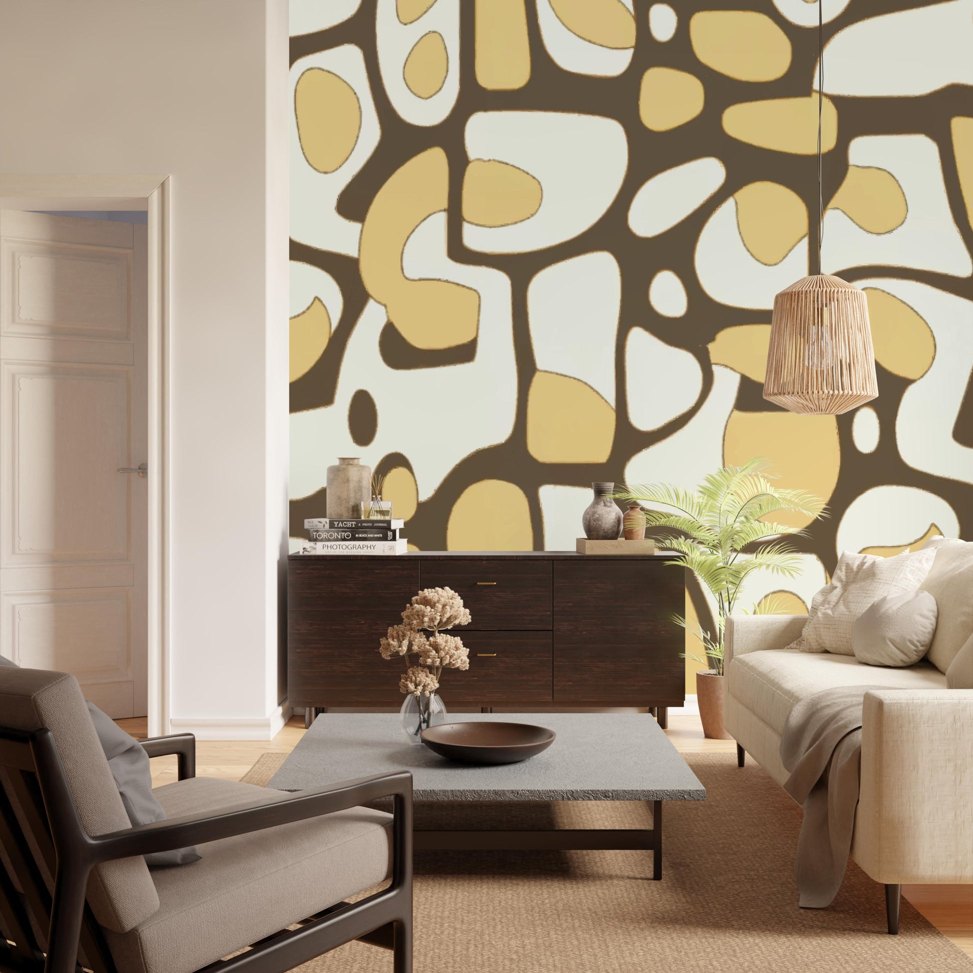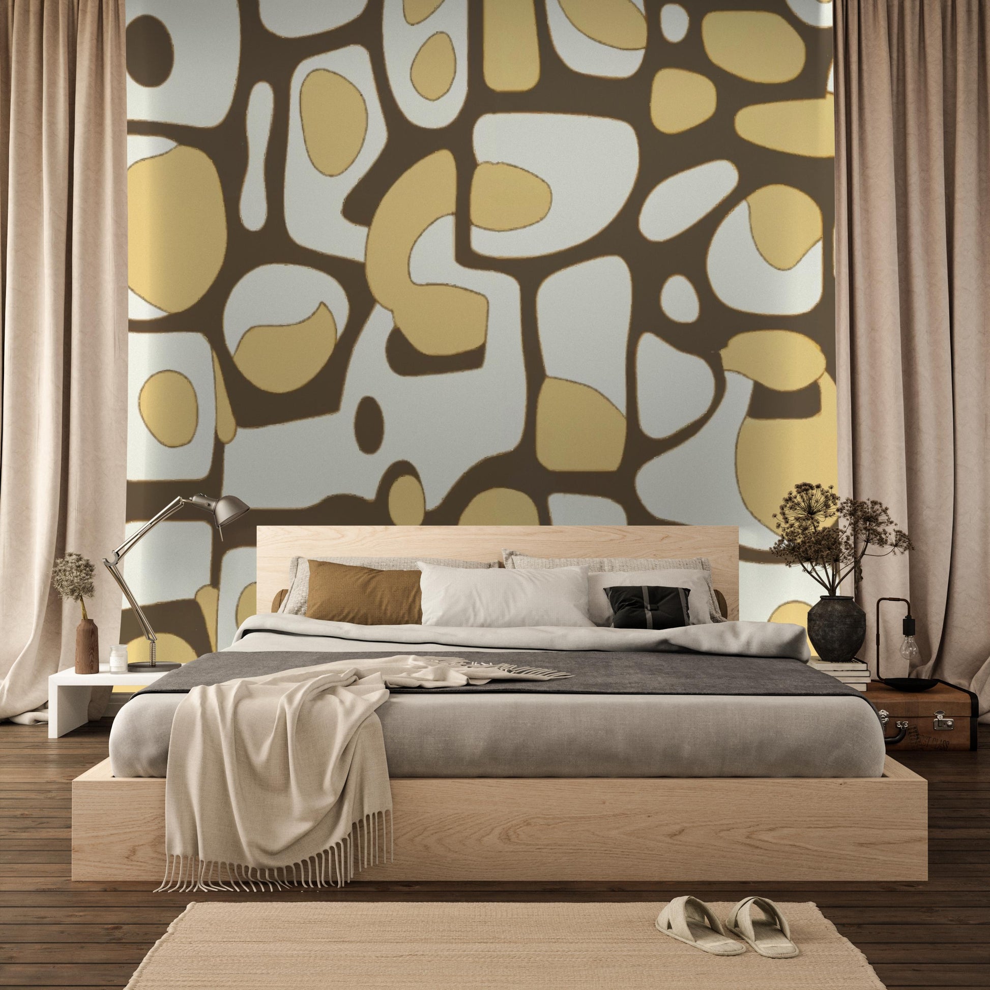A charming and bold wallpaper design that combines vintage and modern aesthetics with its warm color palette and playful abstract shape.