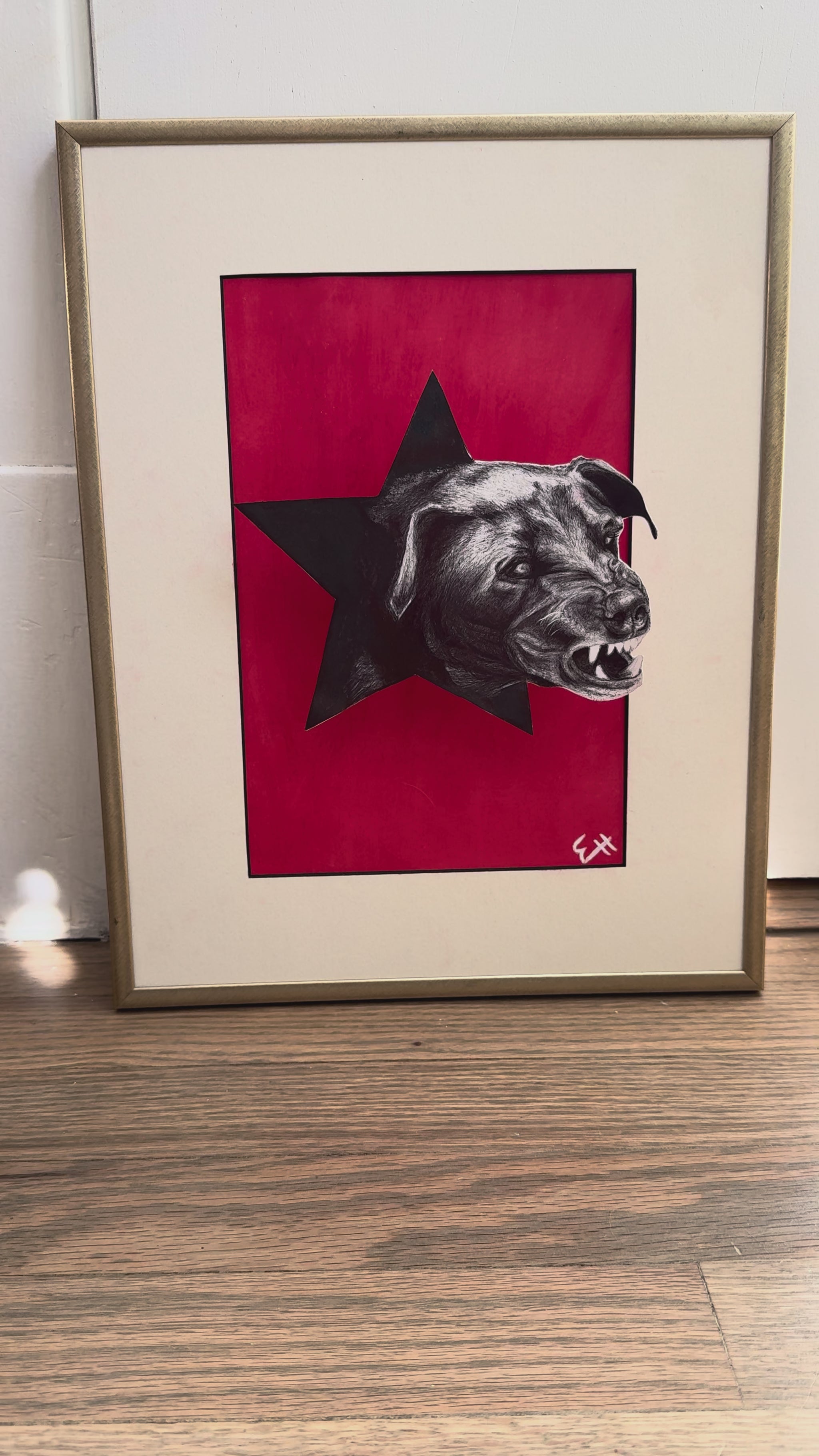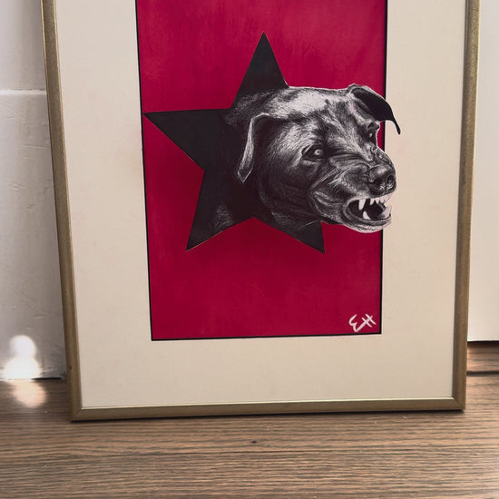 This piece features an original pen illustration of a dog, mounted on wire and elevated 1–1.5 inches above an oil pastel background so it casts its own shadow. The effect is sculptural, dimensional, and completely one-of-a-kind.