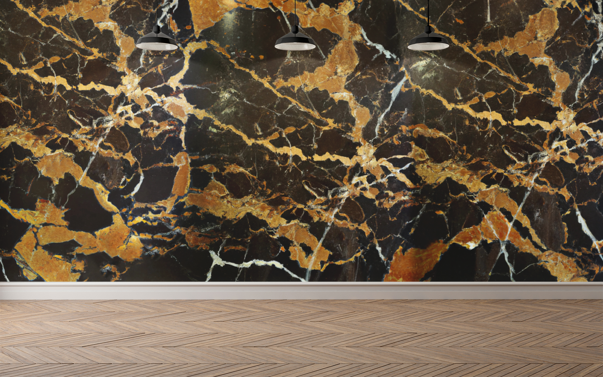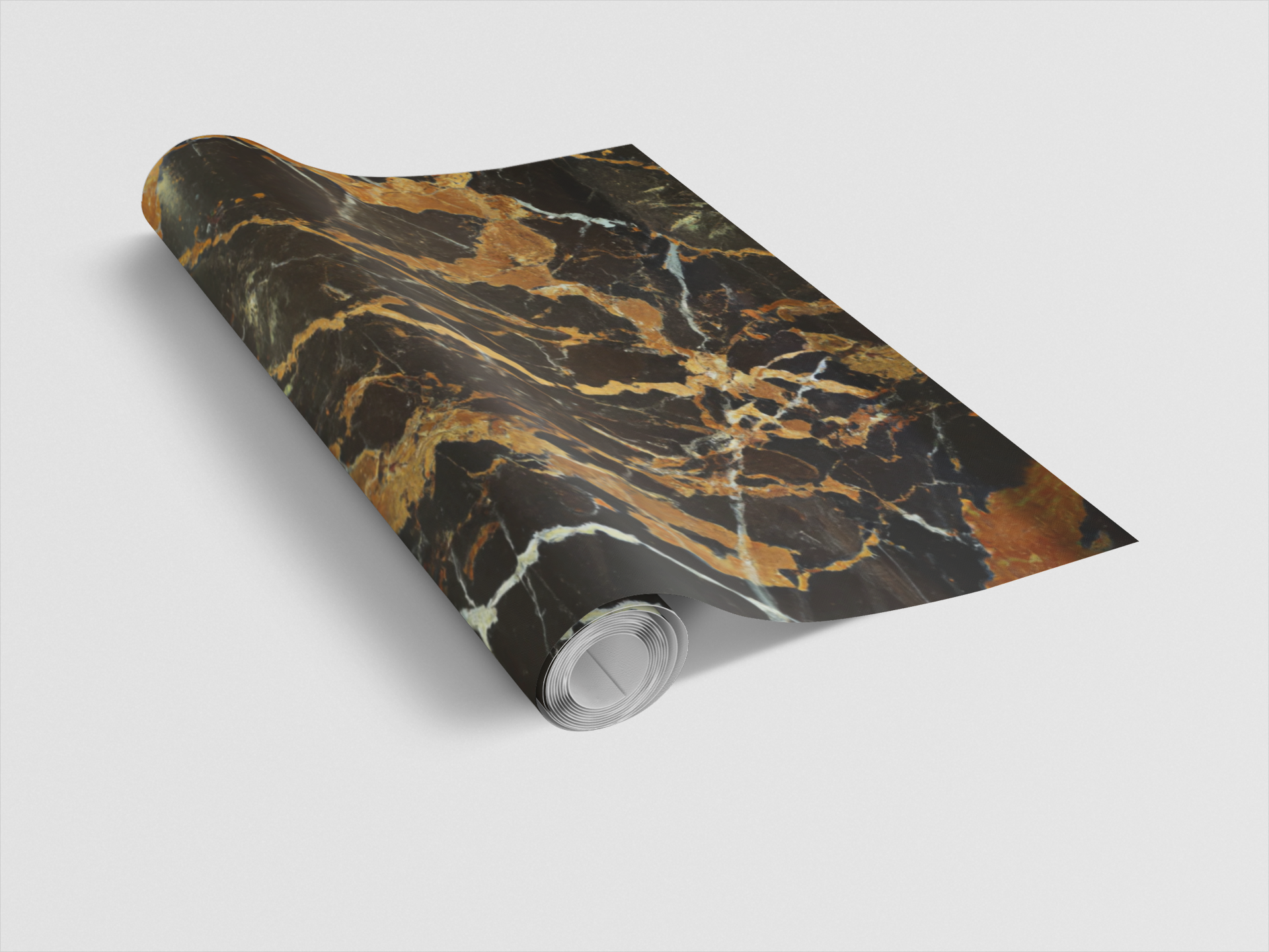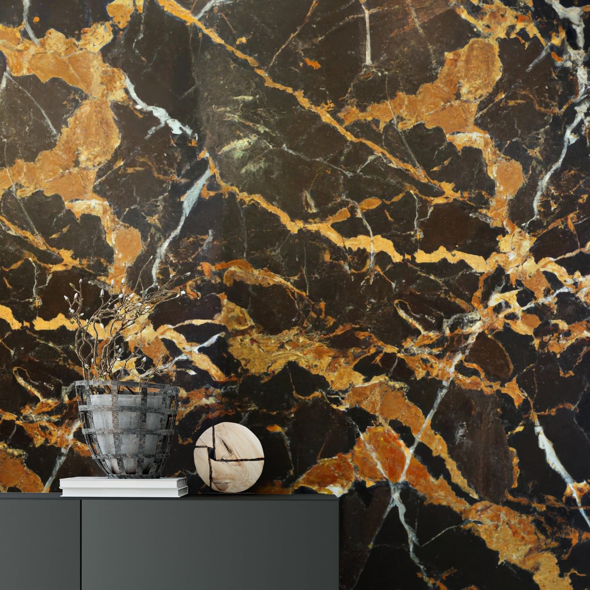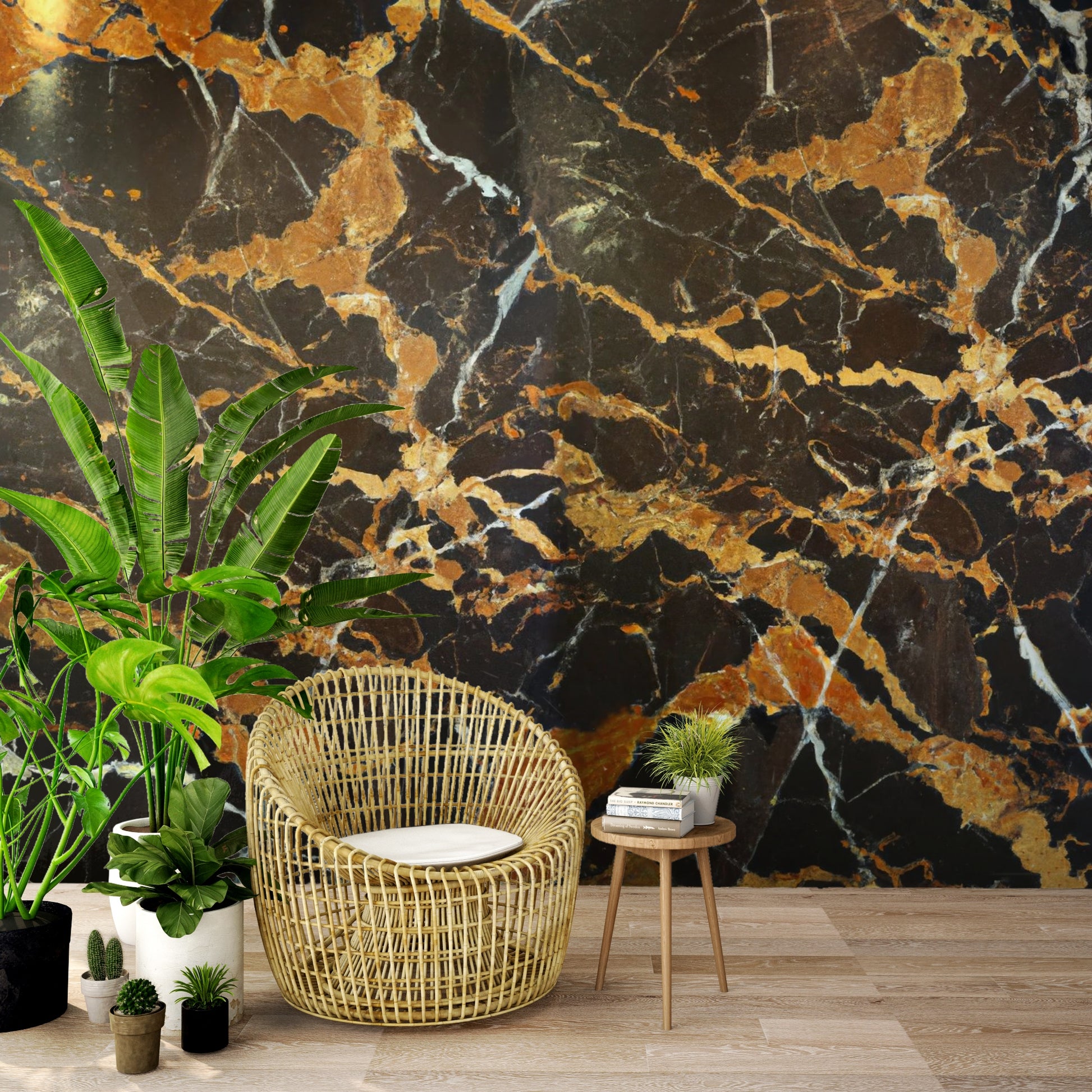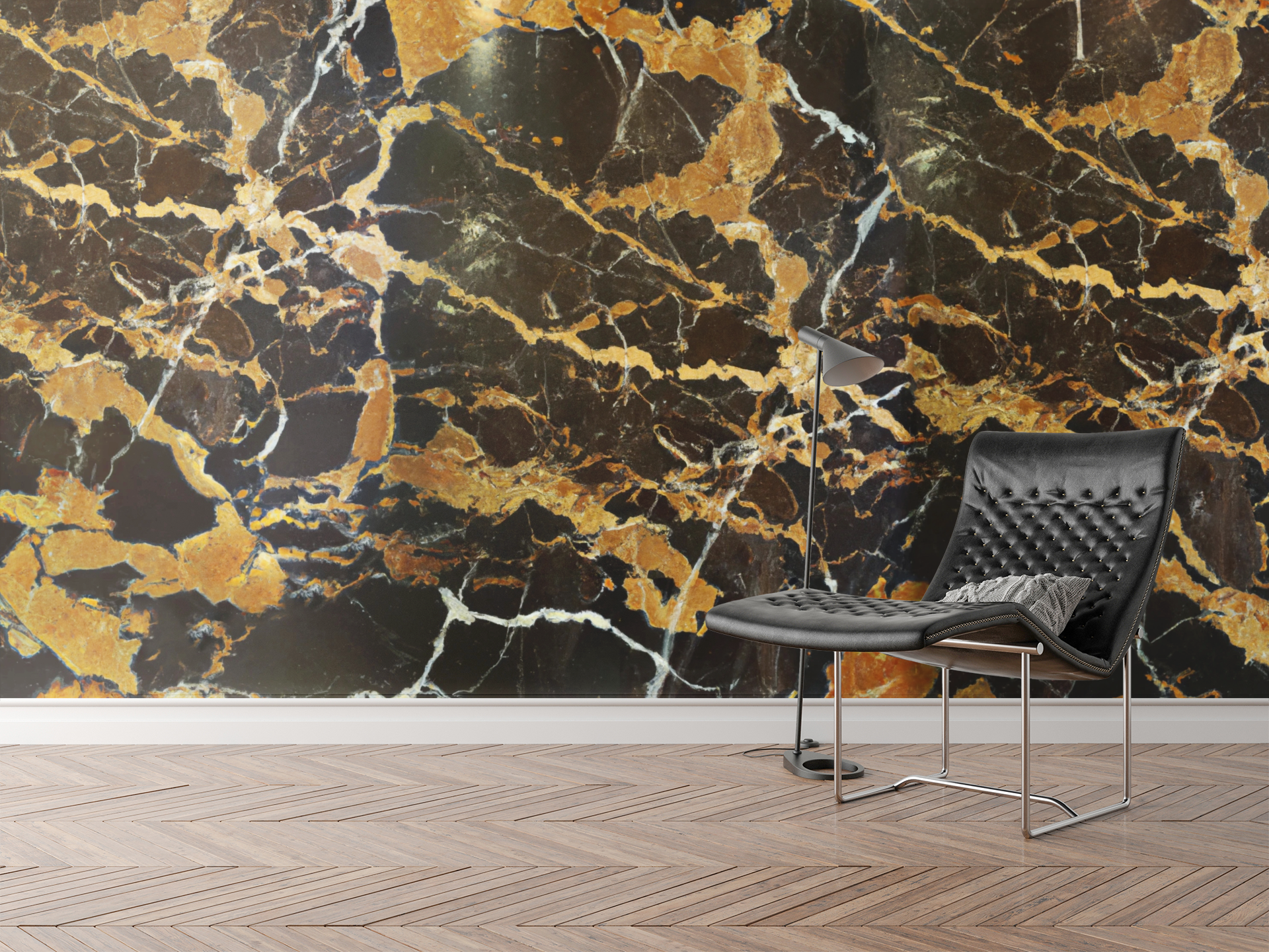 Evoke an air of opulence with our Emperador Gold Marble wallpaper. This luxurious creation draws inspiration from the lavish marble of Spain, known for its rich and regal appearance. This pattern boasts deep black hues adorned with thick, lustrous gold accents, reminiscent of the grandeur of Spanish palaces. Delicate veins of white meander through the design, adding an element of timeless elegance.
