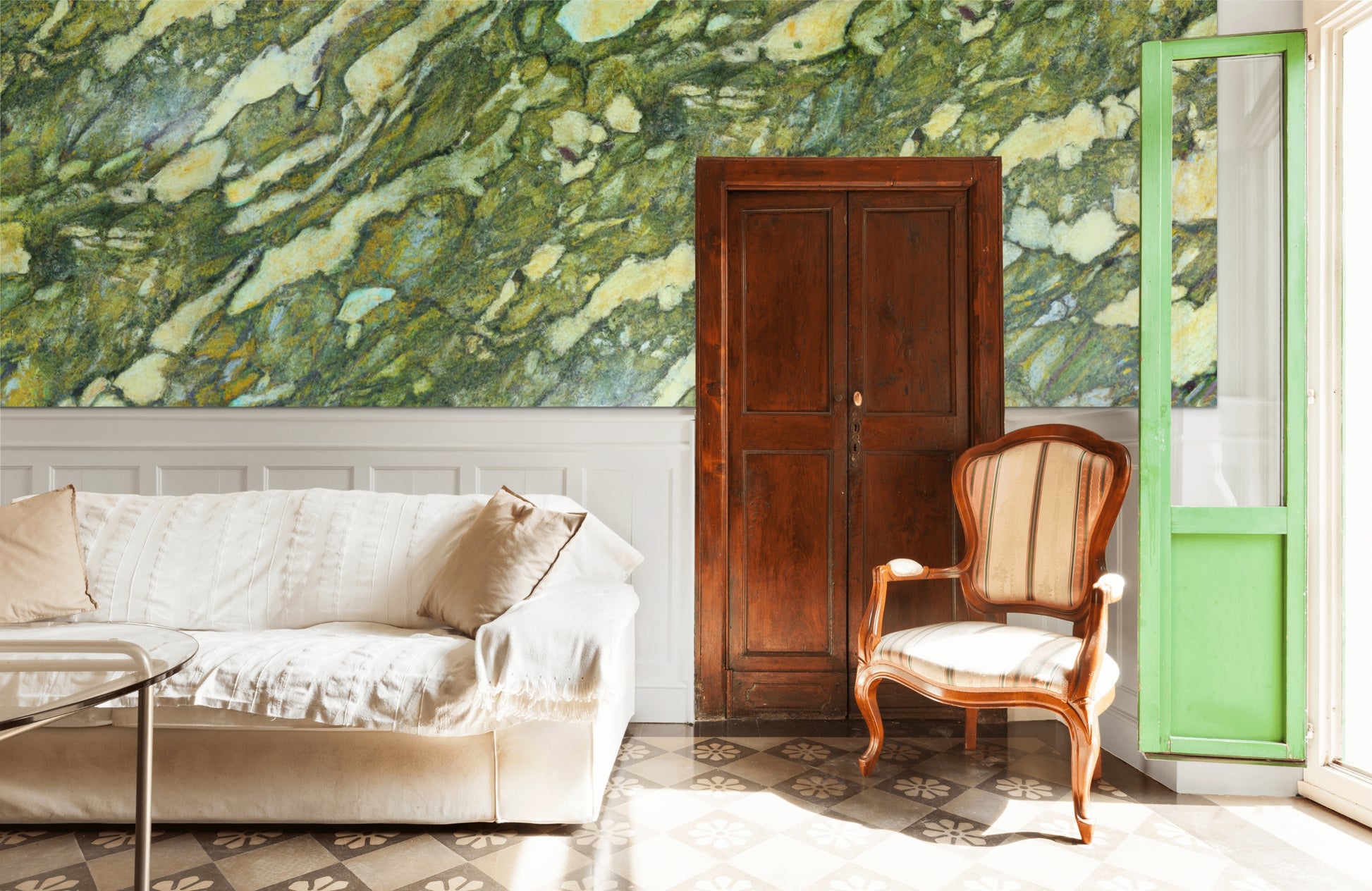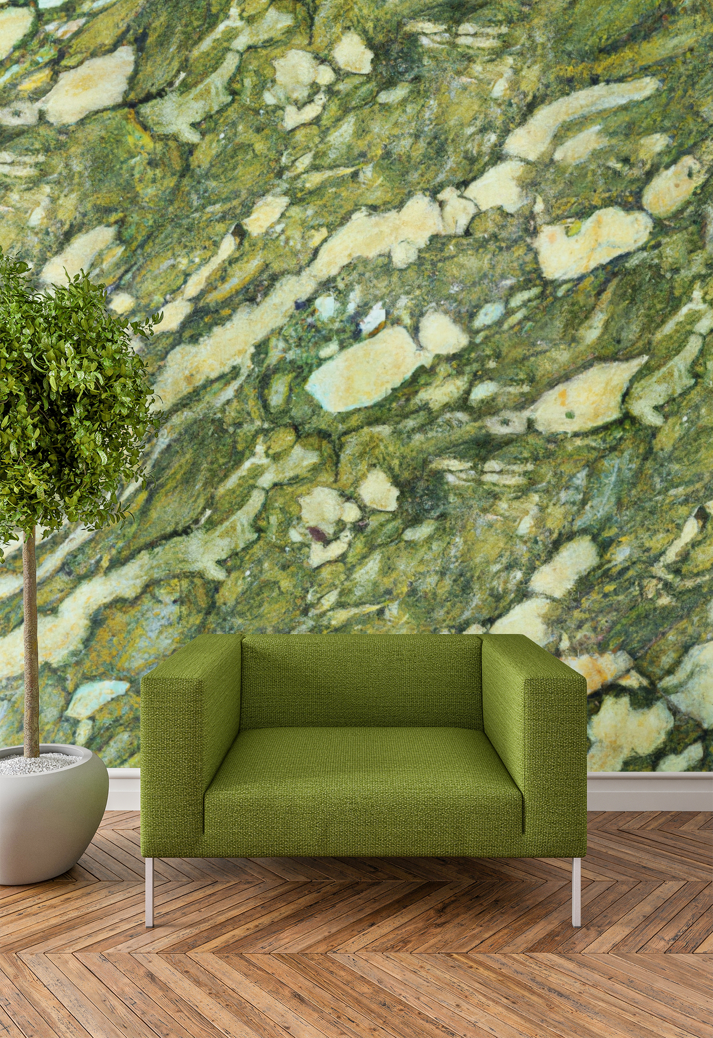 Immerse yourself in tranquility with our Rainforest Green Marble wallpaper, inspired by the timeless beauty of marble from India. This captivating creation boasts soothing pear green tones paired with creamy accents, highlighted by delicate dark green veining that echoes the harmony of nature within an ancient rainforest. The gentle, circular marbling patterns evoke a sense of calm and sophistication, transforming any space into a serene sanctuary.