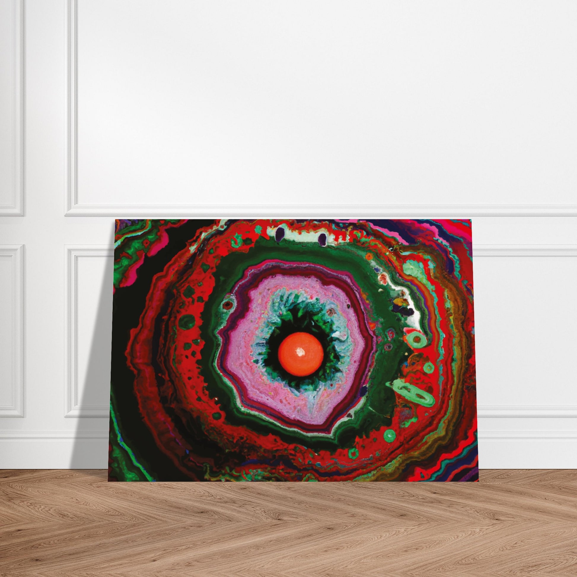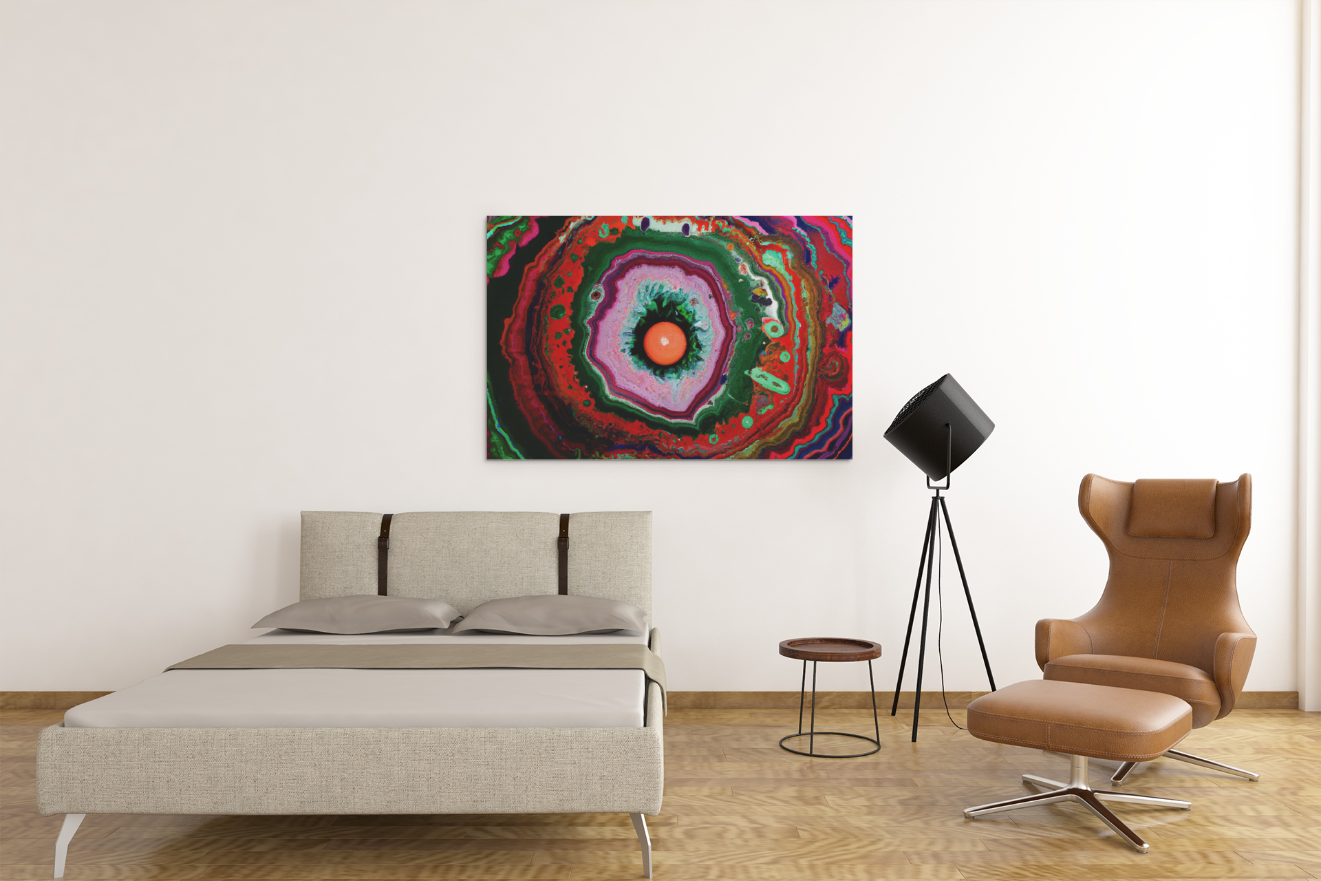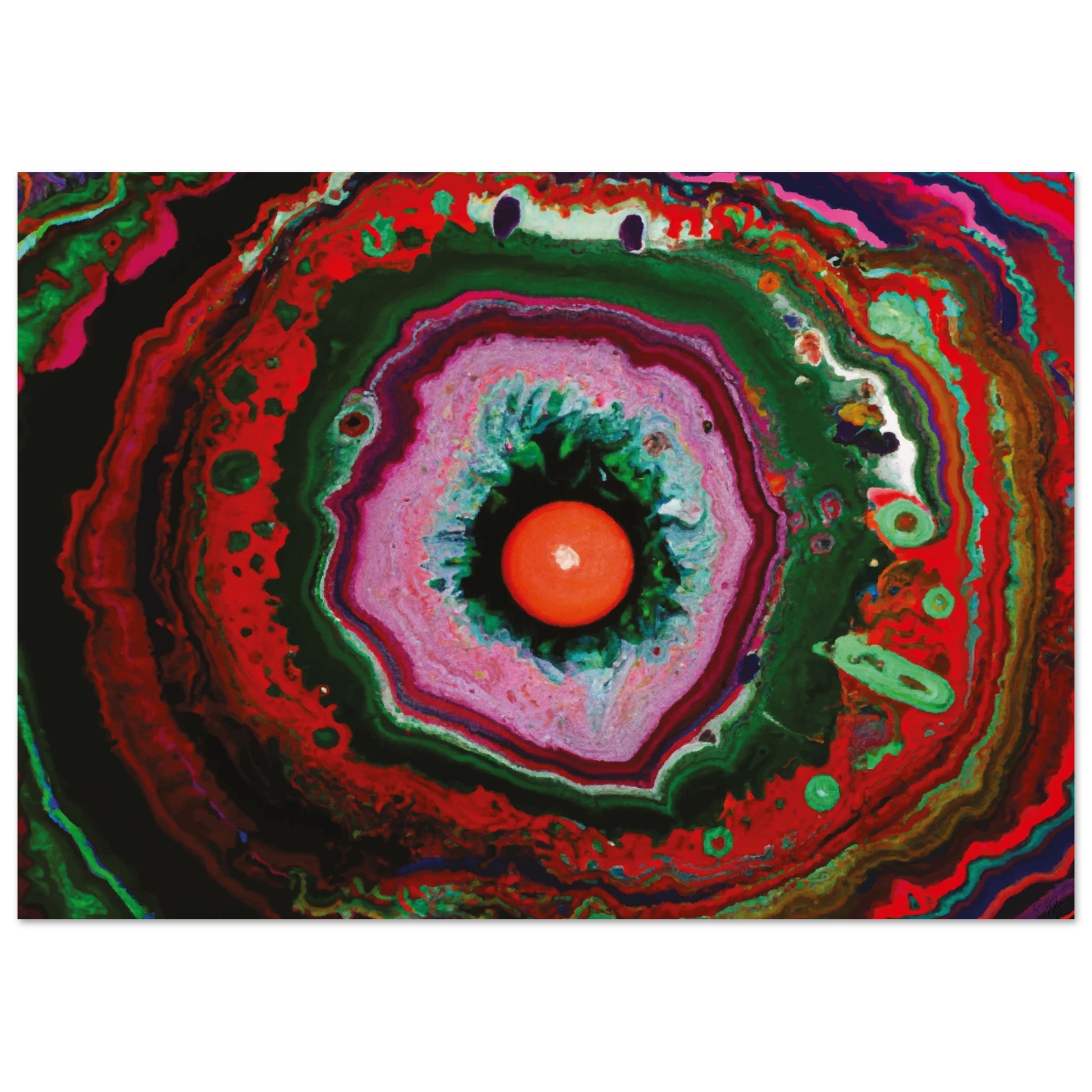 Embodied in vibrant deep reds and greens circling a red centered, “Shepard” captures the pioneering spirit of Alan Shepard's courageous journey. Pops of purples, teal, and pinks amidst the darkness signify the vast possibilities that await, reminding us that in the depths of space, hope shines brightest.