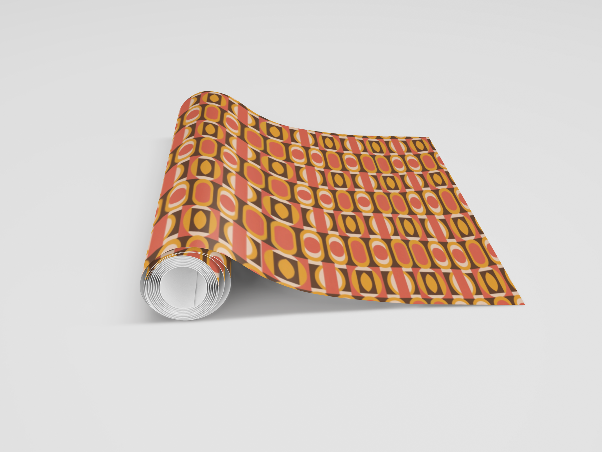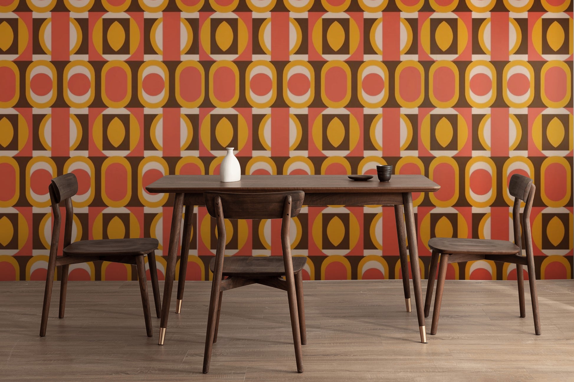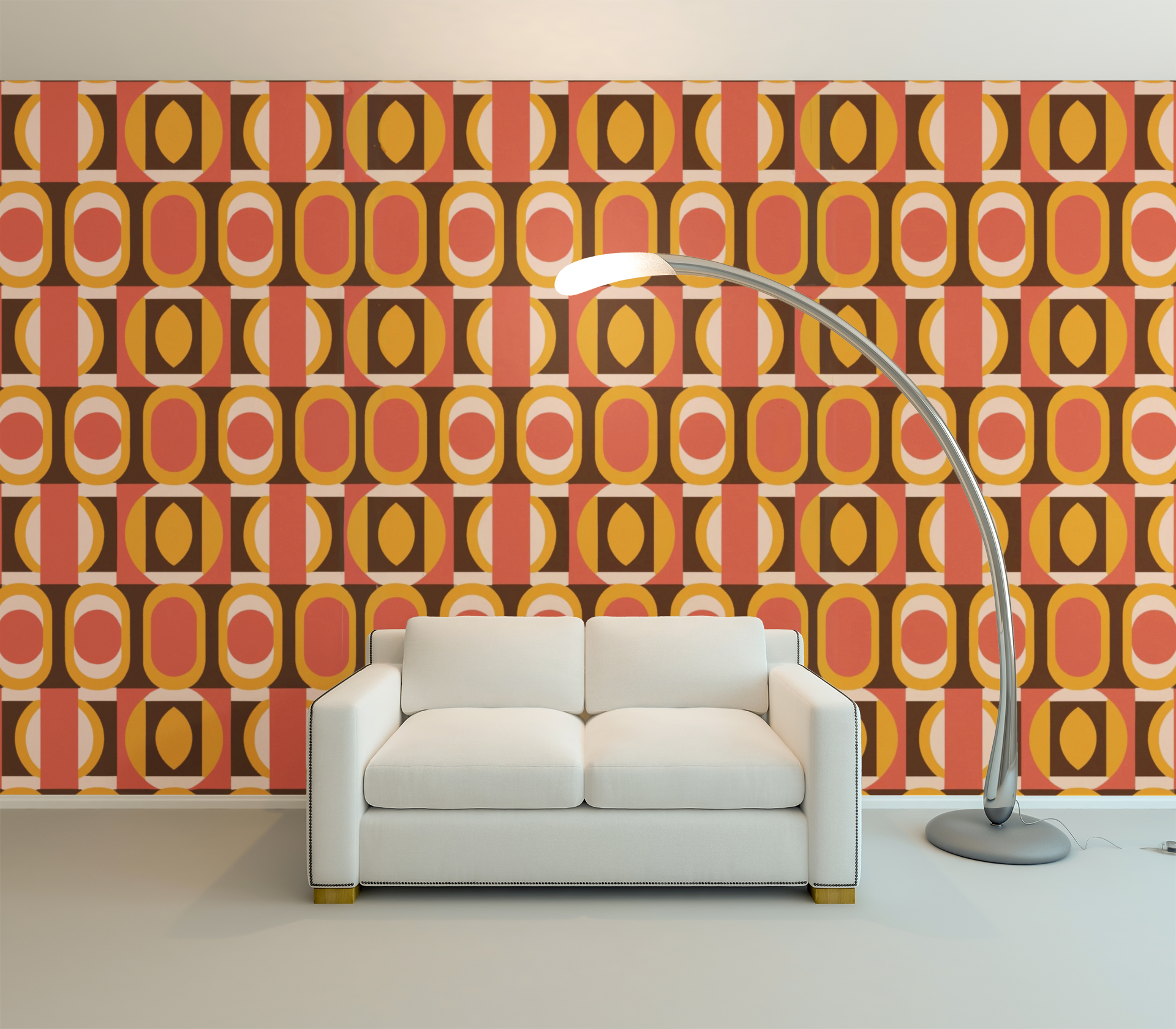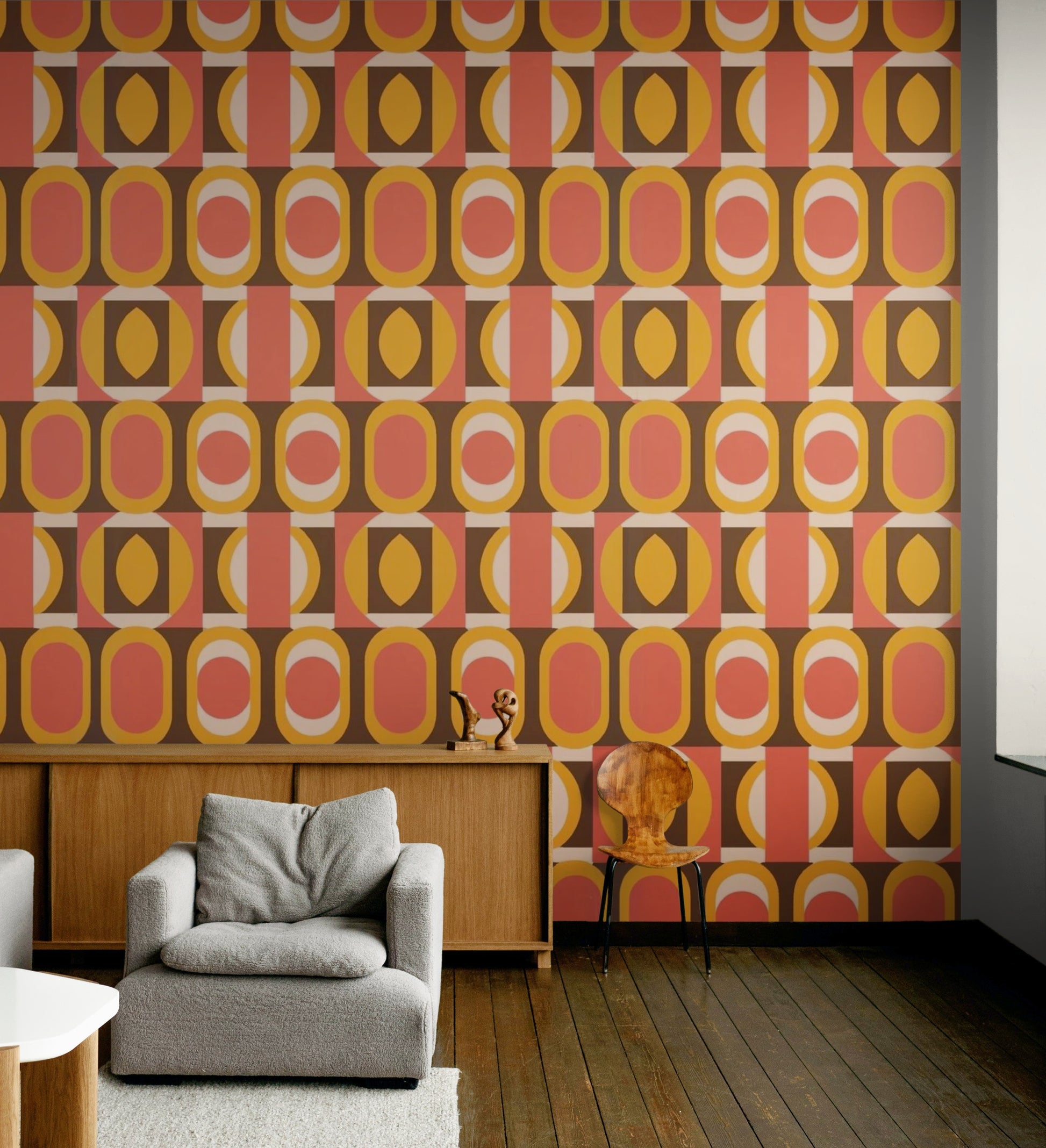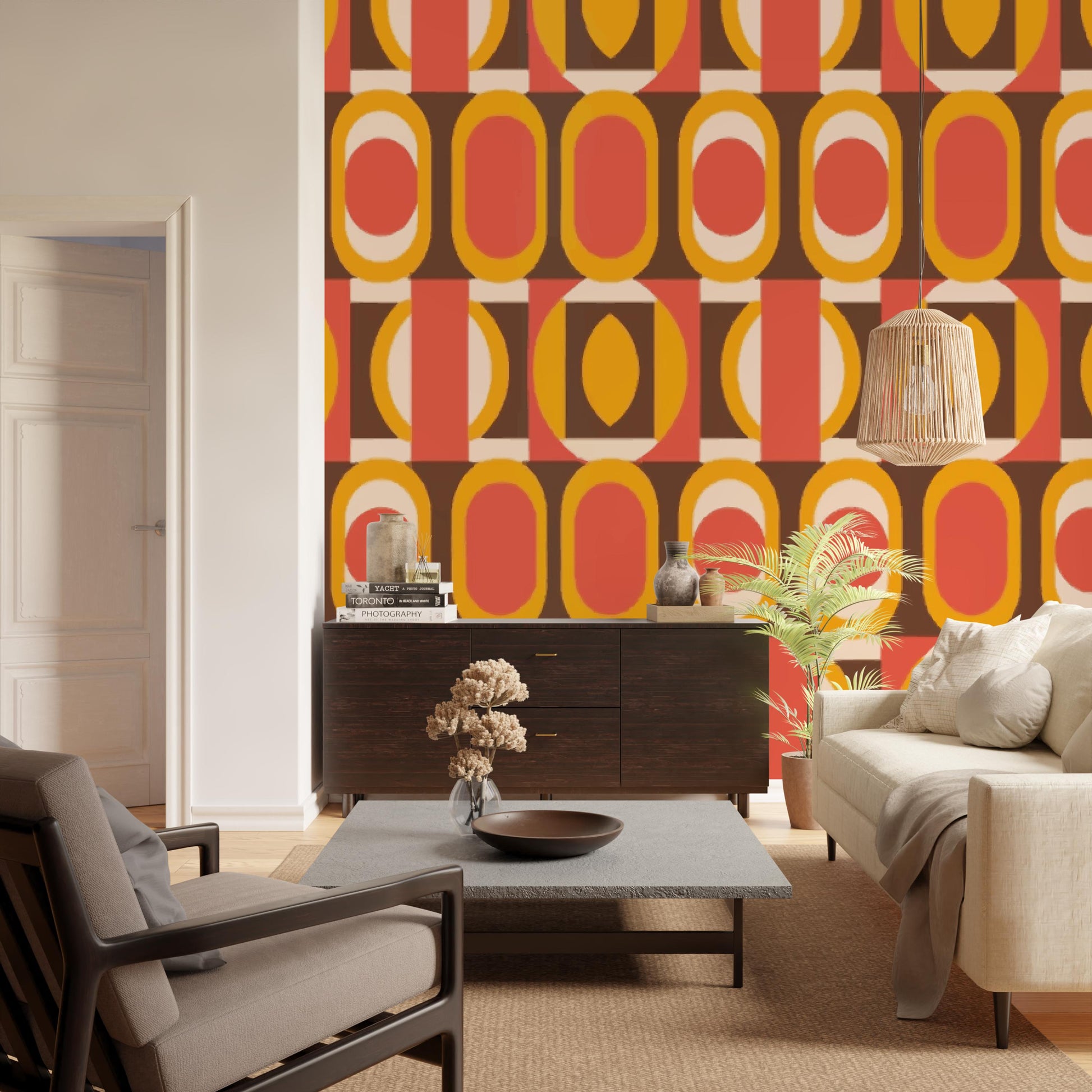 A vibrant and playful wallpaper with a warm color palette of oranges and yellows, featuring an abstract pattern of arches and ovals that adds a touch of retro charm to any space.