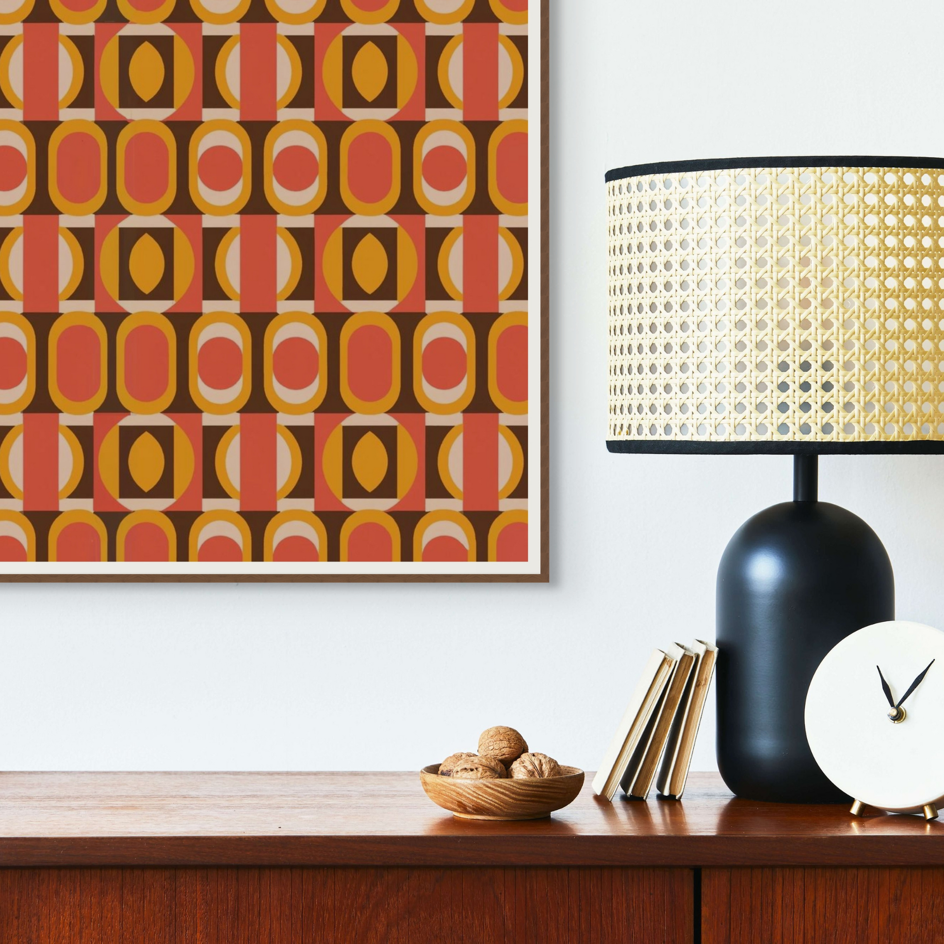 A vibrant and playful wallpaper with a warm color palette of oranges and yellows, featuring an abstract pattern of arches and ovals that adds a touch of retro charm to any space.