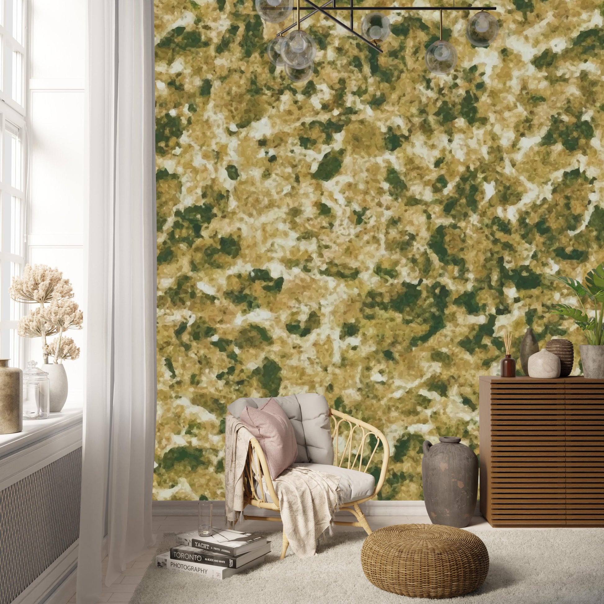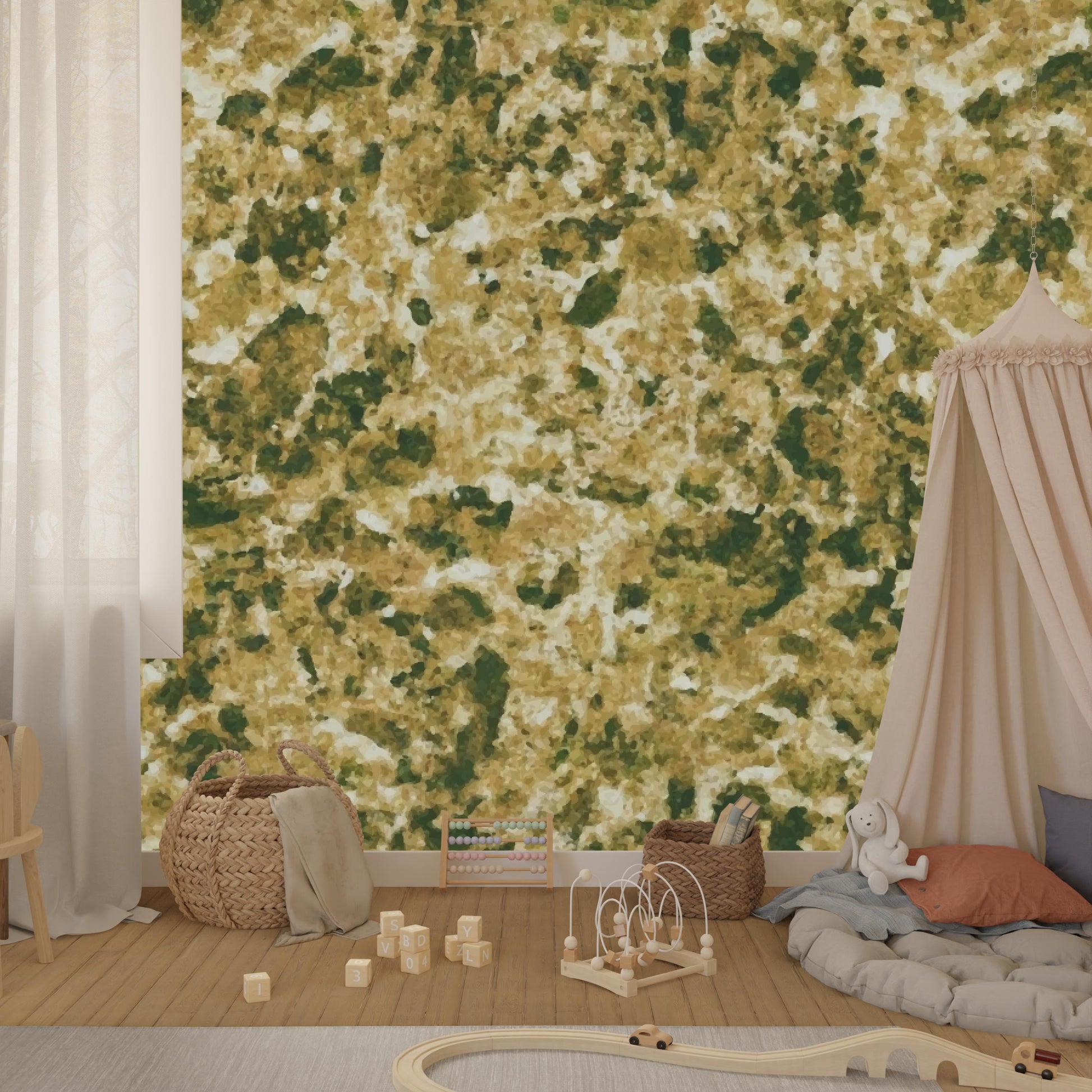 Bring the lush and vibrant colors of nature into your home with Verdant, an impressionist-inspired wallpaper featuring dreamy splotches of yellow greens that evoke the feeling of a sunny day in a lush forest.